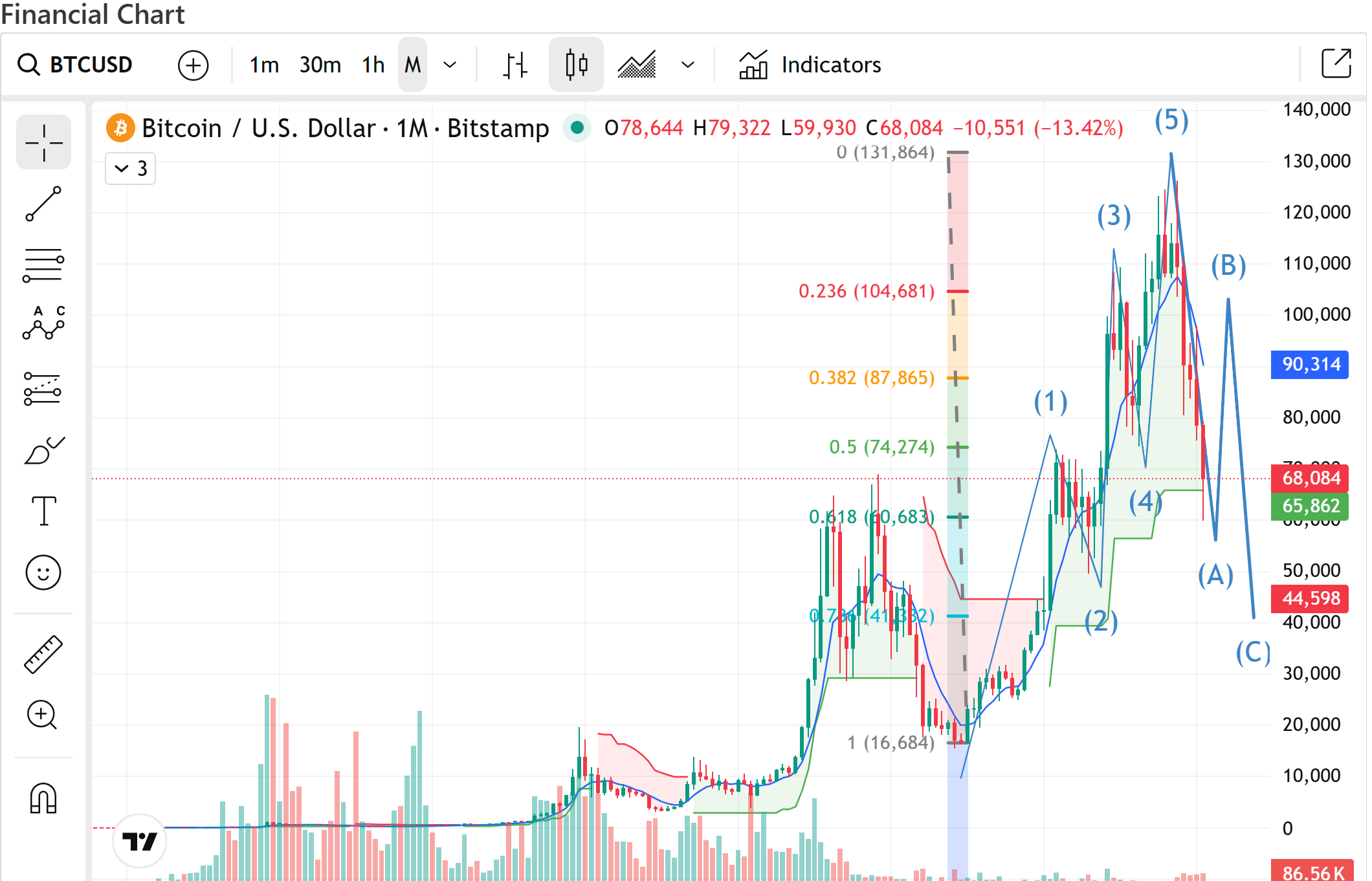 **Primary count (bearish, 80% probability):** The 5-wave impulse from the 2022 low (~$16.7K) to ~$132K is complete. We’re now in wave A of a larger ABC correction. The 50% Fibonacci retracement (~$74K) has been lost. Next major support: the 61.8% retracement at ~$61K.