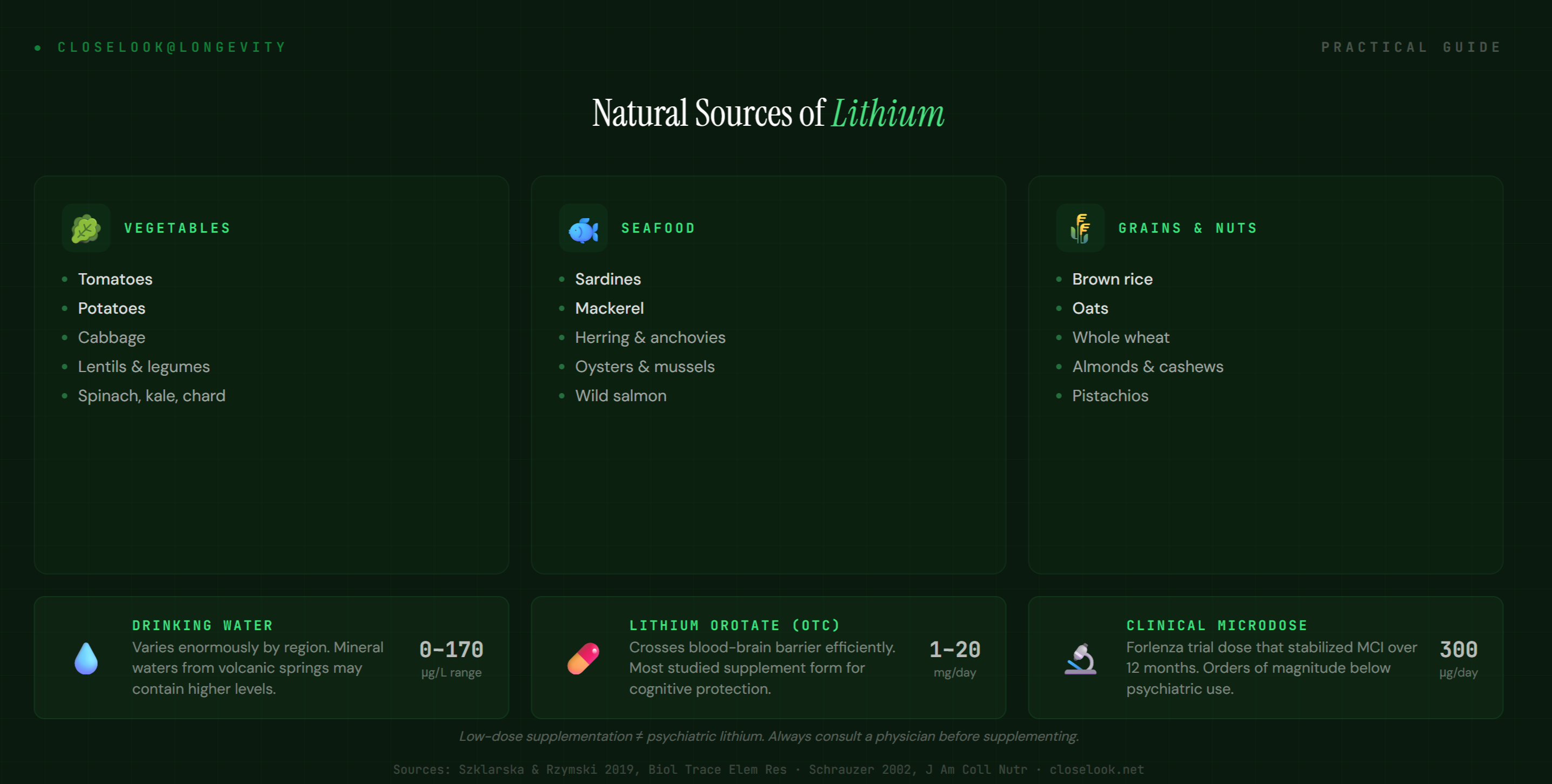 Water. This is the variable most people overlook. Lithium concentrations in drinking water vary enormously by region — from near-zero to over 0.170 mg/L. Mineral waters from lithium-rich springs (historically sought out for their “healing properties” — now we may understand why) can be a meaningful source.