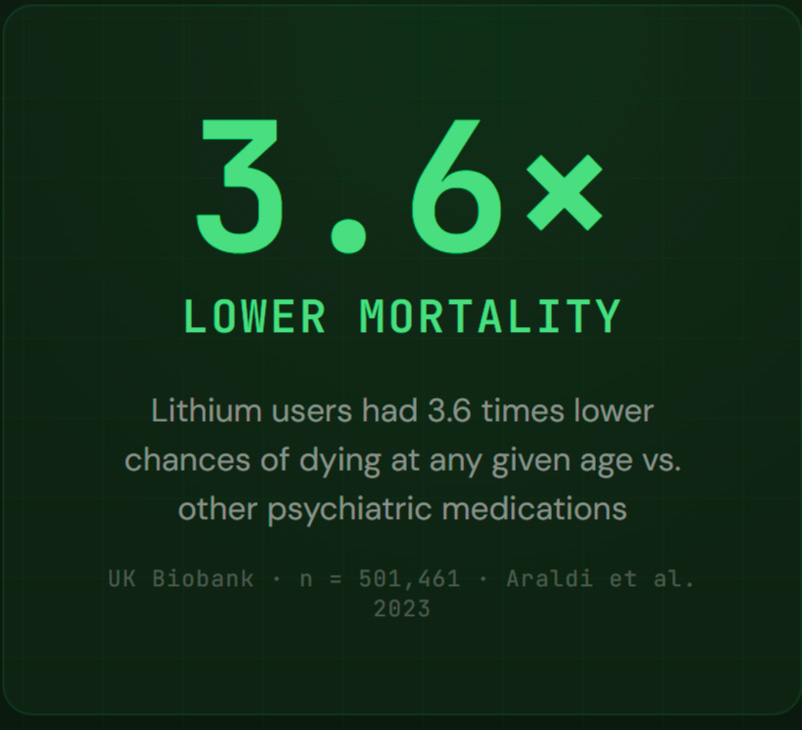 Lithium users had 3.6 times lower chances of dying at any given age compared to users of other psychiatric medications. Not in a small trial — in a UK Biobank cohort of over half a million people.