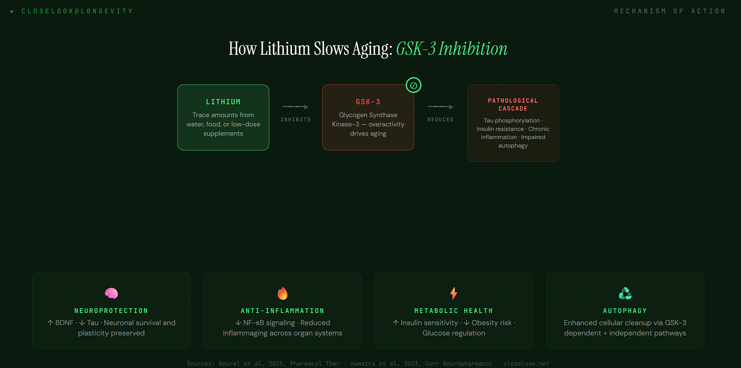The breadth of these effects explains why the mortality signal is all-cause rather than disease-specific. Lithium doesn’t fight one disease — it modulates a fundamental driver of biological aging.
