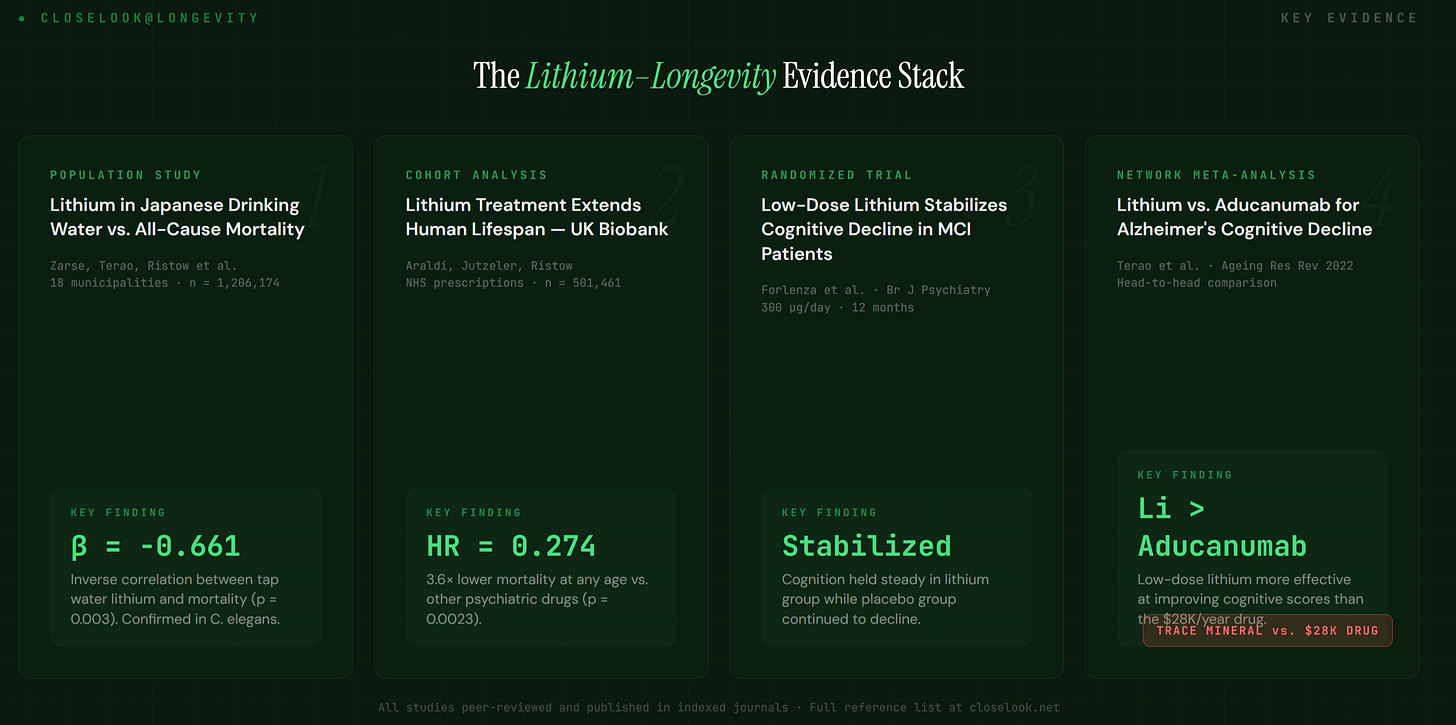 This doesn’t mean lithium is a magic bullet. No single intervention is. But the convergence of population studies, animal models, randomized clinical trials, and clear mechanistic understanding makes lithium one of the most underappreciated tools in the longevity toolkit.