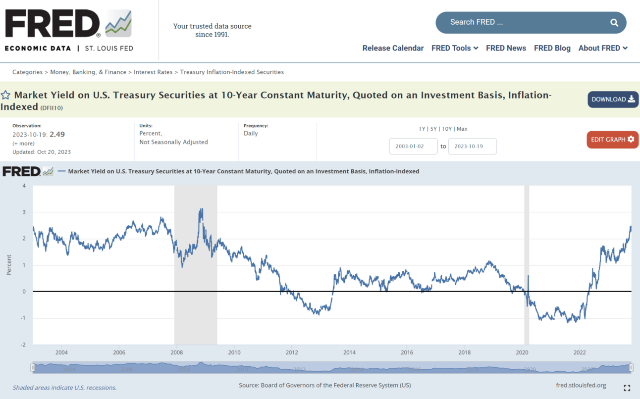 The chart below displays the Market Yield on U.S. Treasury Securities at 10-Year Constant Maturity, Quoted on an Inflation-Indexed Investment Basis (TIPS). The timeline stretches from 2003 to 2023.