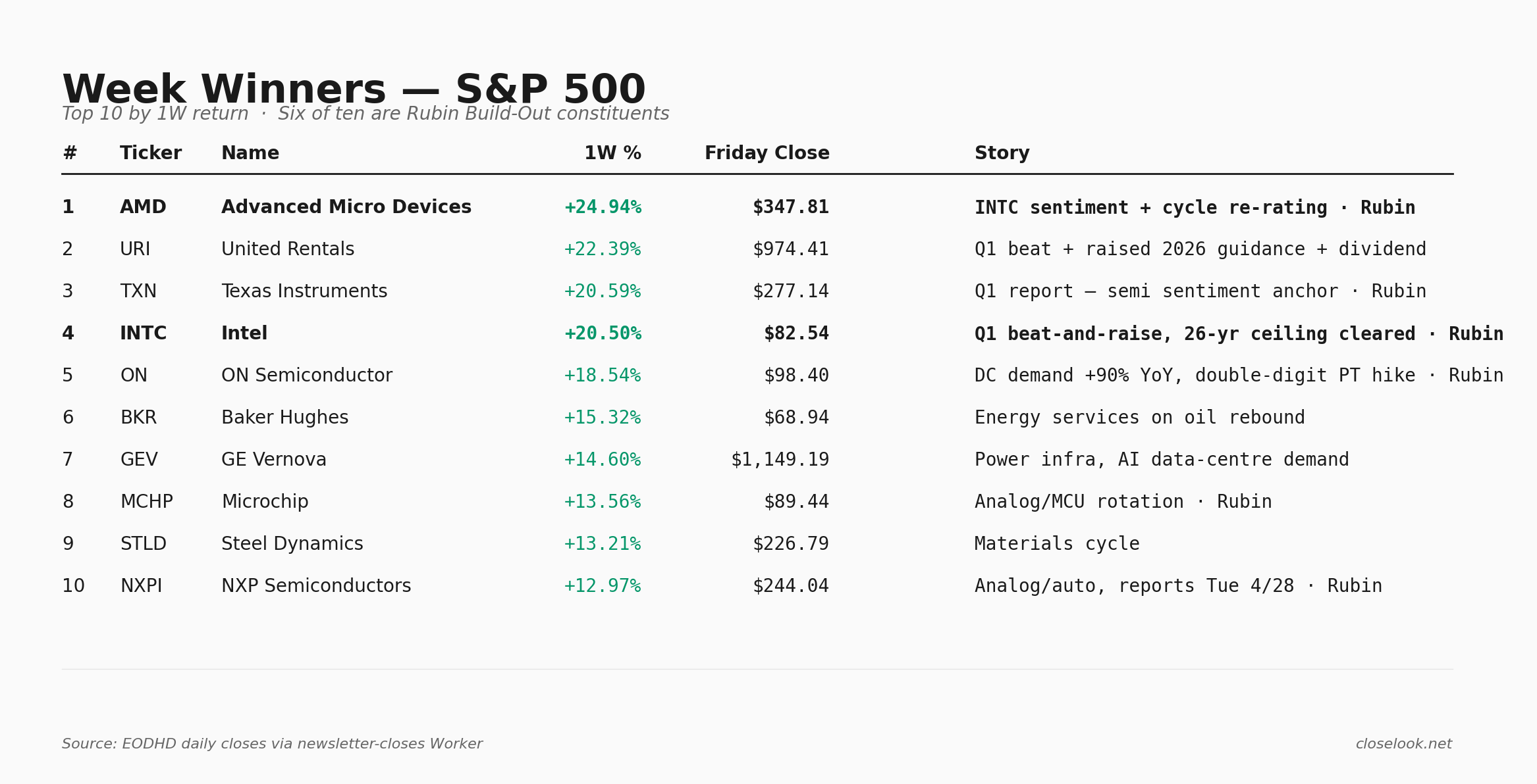 Six of the top ten weekly winners across the entire S&P 500 are Rubin Build-Out 100 constituents. AMD, TXN, INTC, ON, MCHP, NXPI — semiconductors dominating the broad-index single-name leaderboard. The within-tech rotation thesis is visible at the SP500 level, not only inside the functional index.