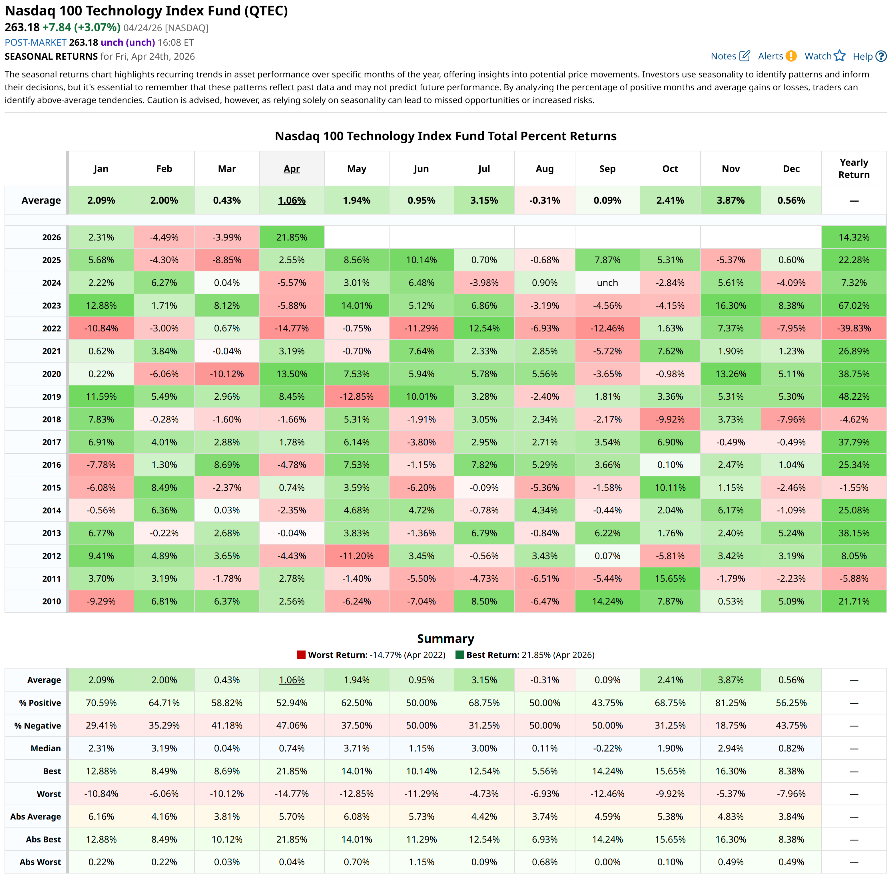 The seasonal map matches every other framework on the table. April 2026 is on track to print one of the strongest Aprils in the QTEC monthly history — currently around +18.54% month-to-date through April 23, the best April on record.