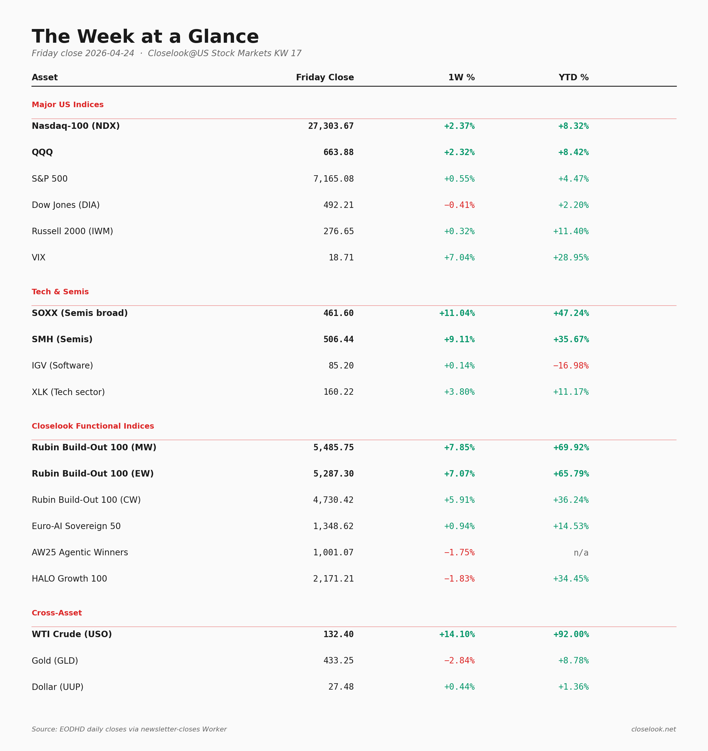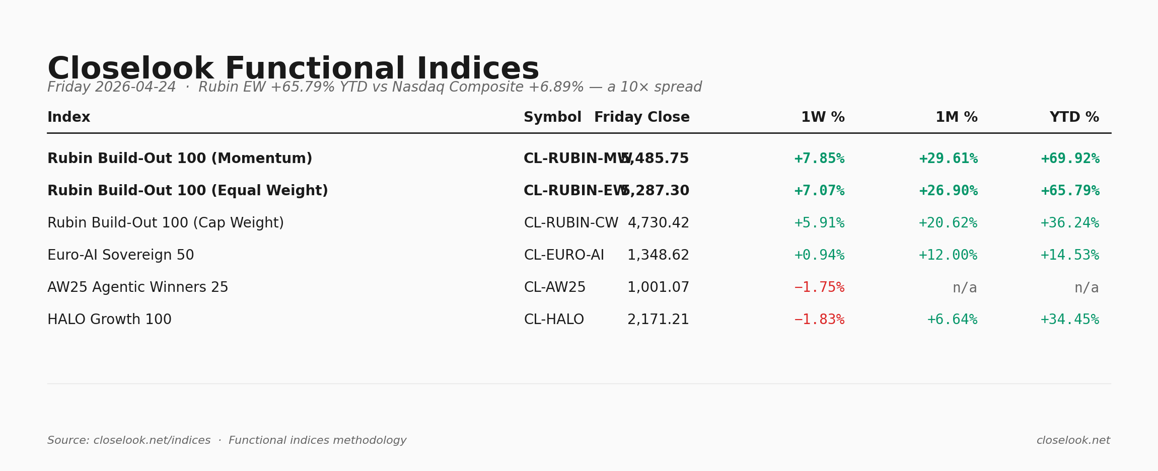 · Rubin Build-Out 100 — 100 stocks, 18 sectors, AI infrastructure (closelook.net/indices/rubin)