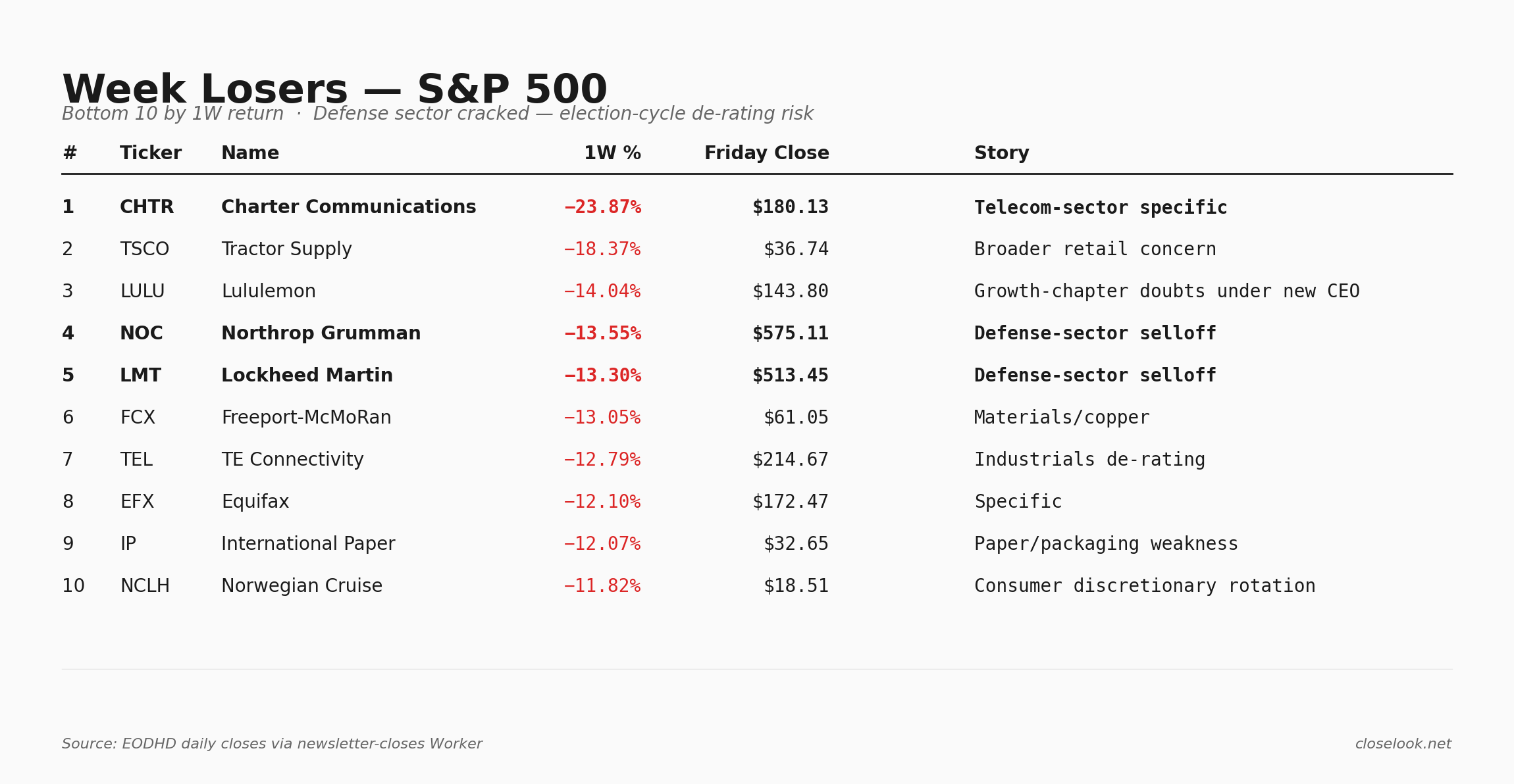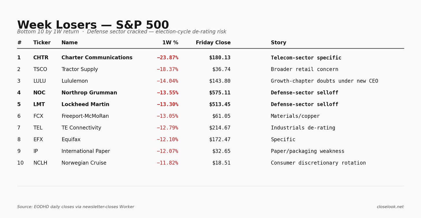 The defense sector cracked. NOC and LMT both down >13% on the week. Coverage centered on election-cycle de-rating risk is being priced into the sector. Notably absent from the SP500 winners list are defense names that dominated in 2025 — a regime change worth watching.