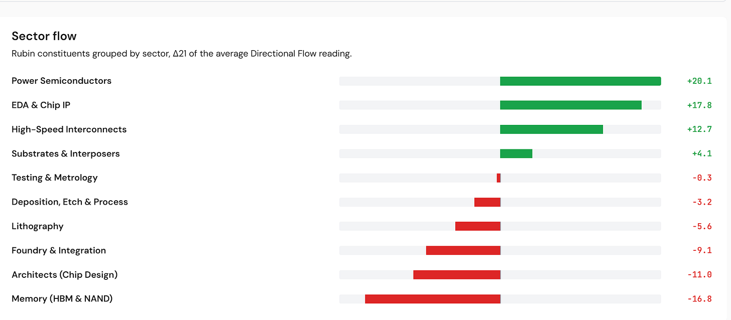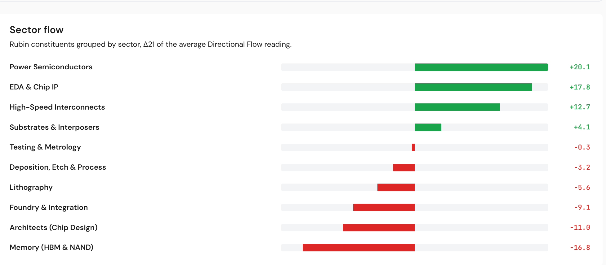 Directional flow within the Rubin universe shows a continued handoff: Power Semis confirming the Mid-Ramp layer joining; Memory and Foundry stabilizing after weeks of distribution; Design heating up, signaling the next chip cycle is loading. This is the textbook signature of a within-tech rotation in progress, not a regime change at the index level.