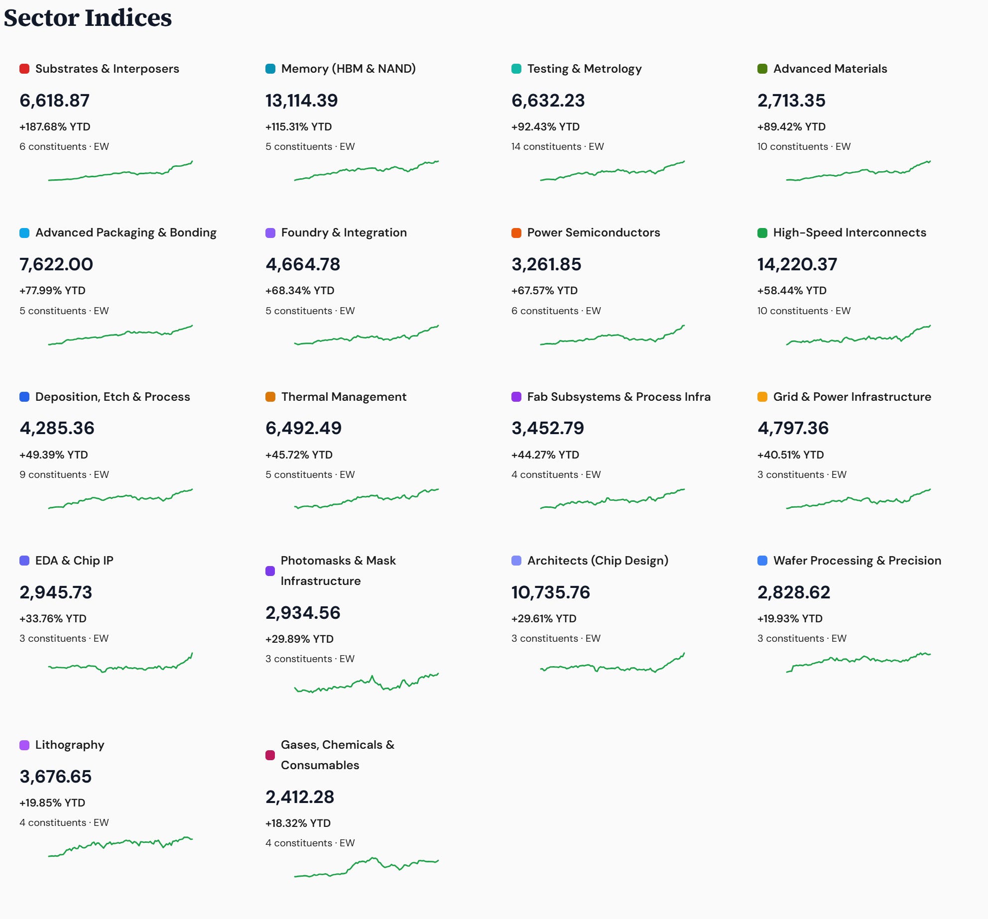 The semiconductor leadership extends beyond the megacaps — interconnects, memory, power, packaging, materials all leading.
