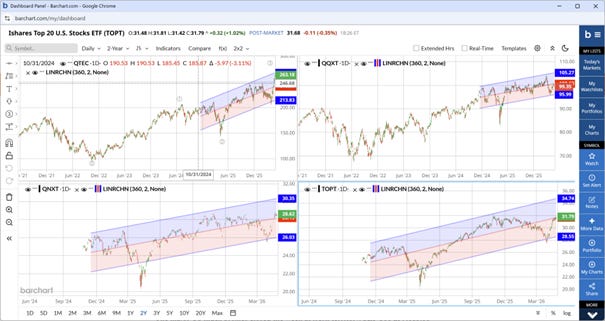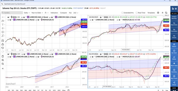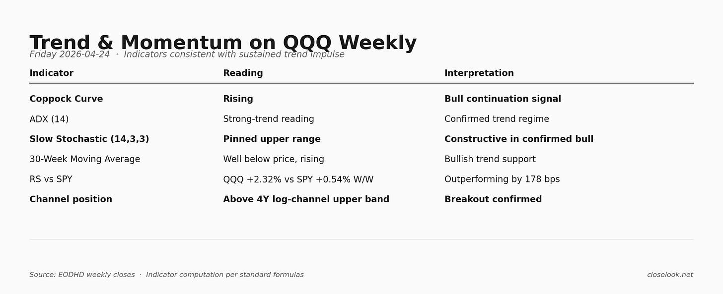 Dimension Reading Verdict Technical QQQ at 663.88 above 4Y log-channel upper band, fresh ATH, RS to SPY widening, Coppock rising, ADX strong-trend, Stoch pinned overbought ✓ Constructive Macro Money Temperature in Transition zone; Q1 earnings 80%+ beat rate; Fed expected hold; Thursday data day (GDP + Core PCE + BoJ + AAPL) heavy with binary outcomes ⚠ Data-dense ahead Seasonality April 2026 on track for one of the strongest QTEC Aprils on record; May historically thins to a coin flip; July is the destination (94% hit rate, +4.1% avg) ✓ Constructive into early May