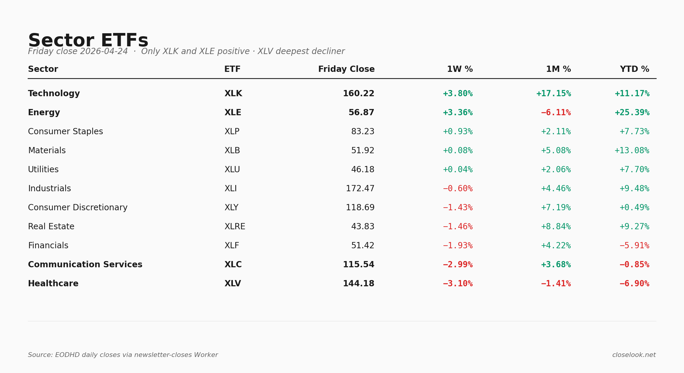 The Closelook Rubin Build-Out 100 captures the AI hardware supply chain — Memory, Packaging, Power, Cooling, Interconnect, Substrates, Lithography, Foundry, EDA. Six layers, 18 sectors. Each sub-sector answers a specific question about the AI build-out: which layer is leading, which is saturating, and which is the next handoff candidate. A reader following the Rubin sector dispersion sees Power Semis up 13.5% this week and knows that GB200 /Rubin power delivery is the active layer. A reader following XLK sees a single number and learns nothing.