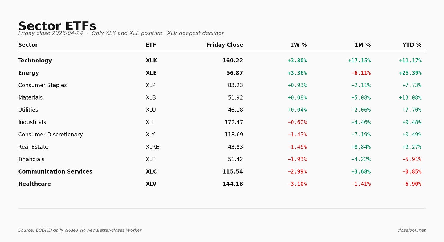 Sector rotation tilts further into growth and away from defensives. XLK and XLY remain the twin engines into earnings. XLE caught the oil-rebound bid this week — sustainable only if the Hormuz situation re-escalates; otherwise, it means reversion to the mean. XLF holds its bid but trails meaningfully. Watch for XLC to accelerate on the Alphabet and Meta prints — Communication Services has been a base-building theme for three weeks, and platform-scale AI monetization needs a fundamental confirmation moment.