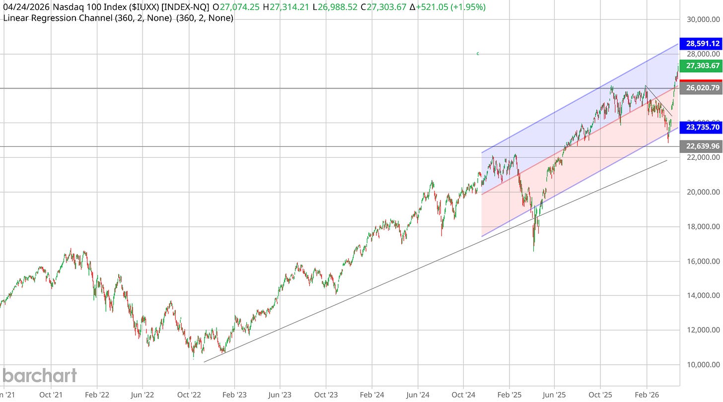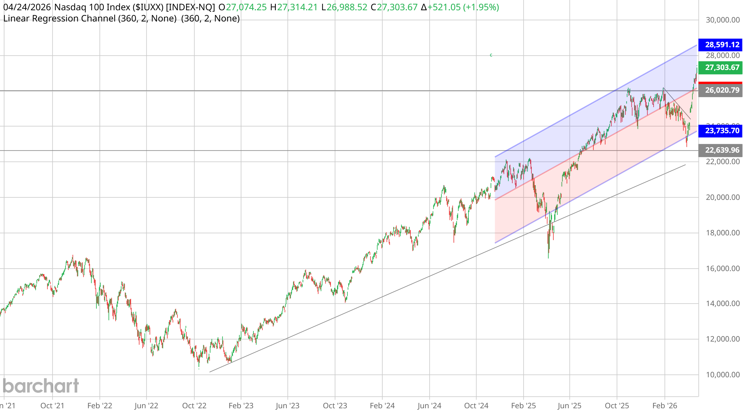 The numbers above set the structural read at a glance. The headline: semis vertical (SOXX +11.04%, SMH +9.11%), Rubin Build-Out 100 extending its YTD lead at +65% (EW and MW), software at the index level held flat (IGV +0.14%) despite NOW and IBM cracking individually. The chart below shows where the Nasdaq-100 sits on the long-term log channel.