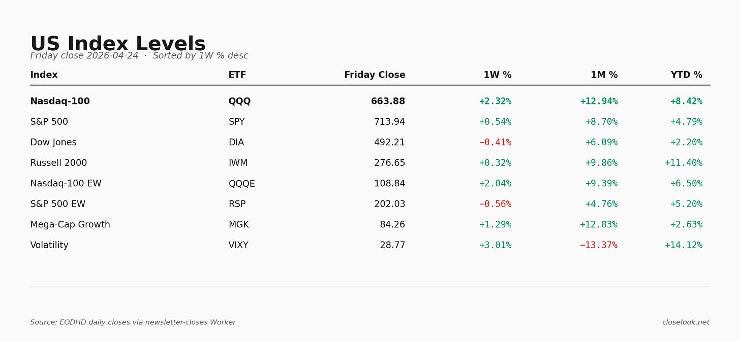 The major US index proxies closed the week at fresh territory. S&P 500 at 7,165.08 Friday, up +0.55% on the week to a fresh all-time high. Nasdaq-100 (NDX) at 27,303.67, up +2.37% on the week — QQQ tracked it at 663.88, +2.32% on the week from the prior Friday’s 648.85.
