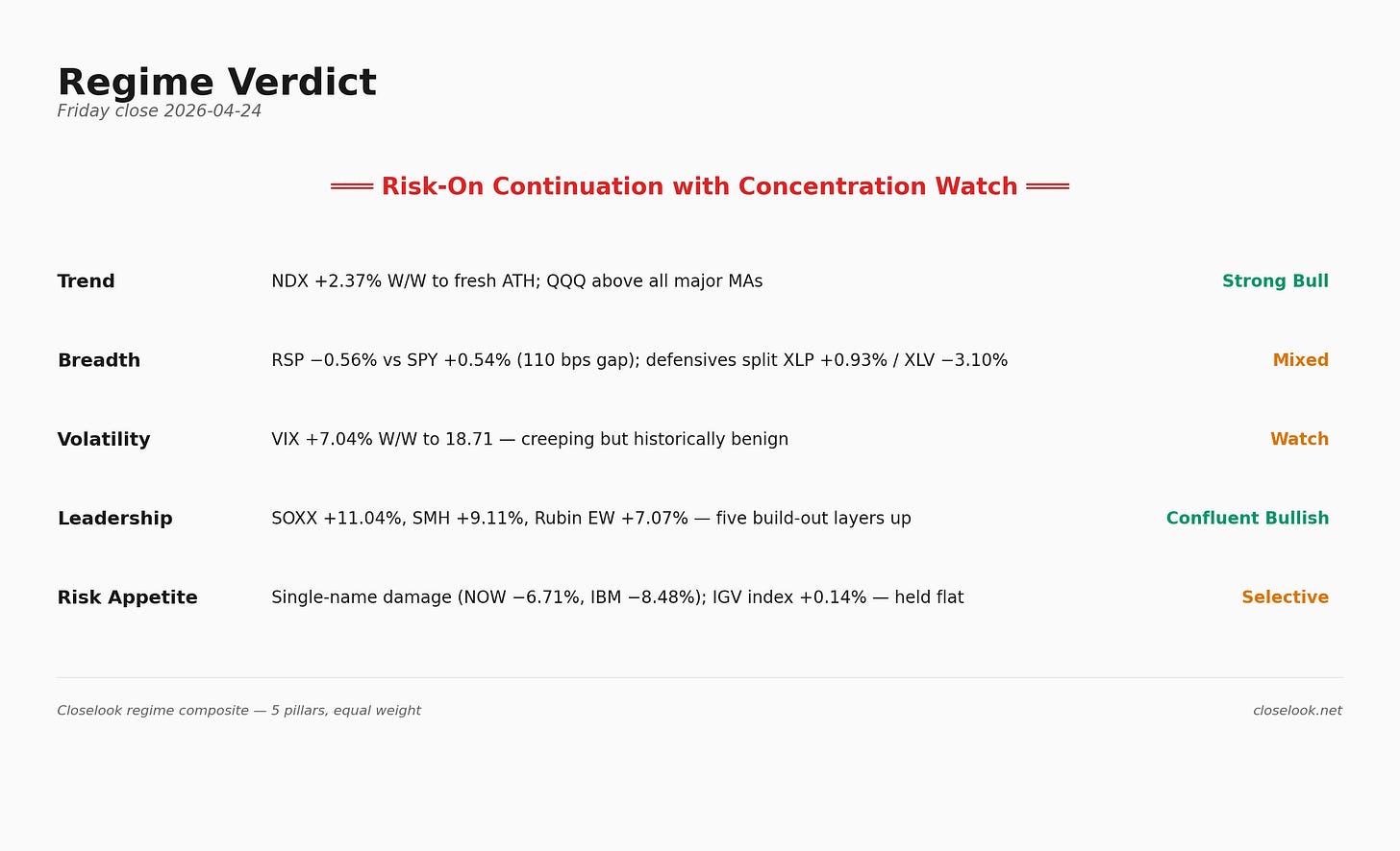 The regime reads Risk-On, with leadership concentrated in semiconductors and distributed across five build-out layers. Headline indices held or extended; thematics narrowed back into AI infrastructure but expanded within it. Breadth at the index level participated but did not lead; breadth inside the AI hardware supply chain was the diagnostic feature of the week.