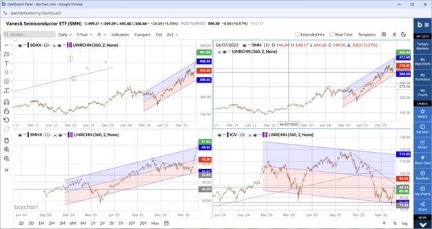 All three pillars are constructive. The within-tech rotation thesis is the framework that explains both the software single-name break and the semiconductor extension simultaneously. What to respect: the upper extension of the channel — do not pyramid into 670—what to trust: the trend. The risk-off trigger is Money Temperature 75+ or sector breadth dropping below 50% — neither is on this week’s card.