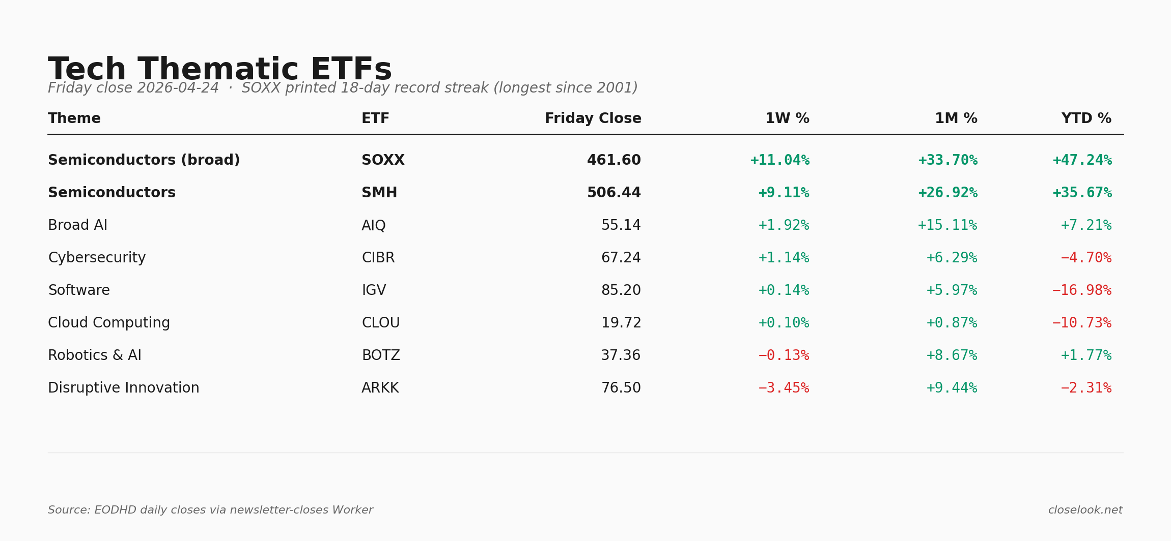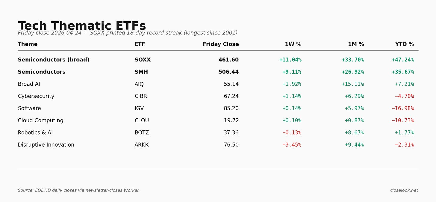 The Tech Thematic split is the diagnostic feature of the week — but not in the direction the headline narrative suggests. SOXX +11.04%, SMH +9.11%, IGV +0.14%. Software at the index level held flat; ARKK (- 3.45%) and CLOU (+0.10%) bracket the broader risk-software complex. CIBR +1.14% (Cybersecurity) and AIQ +1.92% (Broad AI) — both held positive.
