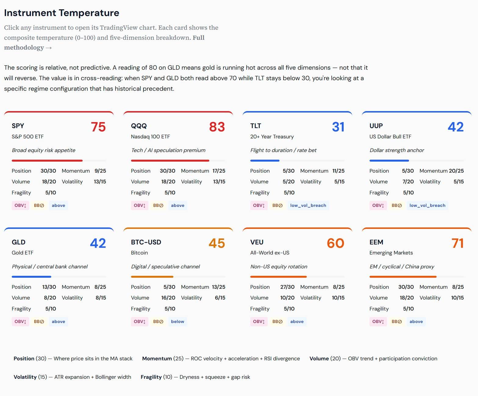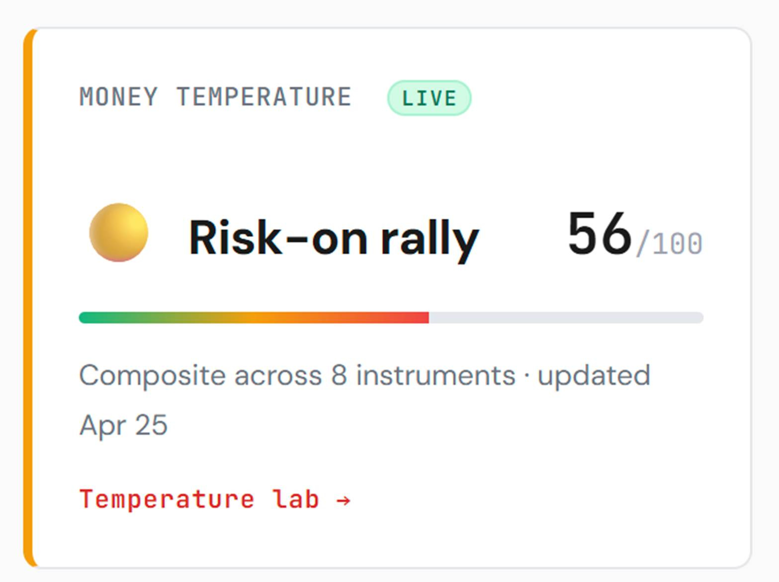 The Money Temperature pipeline reads in the Transition zone this week — the same regime as the prior week, with mechanical inputs pulling in opposite directions. Higher oil and a firmer dollar push the score warmer; modestly higher yields and an uptick in VIX push it cooler. The net is a flat week-over-week reading that confirms the structural risk-on posture without signaling any shift toward overheating. A score below 75 leaves the framework constructive on equities. We begin reducing gross exposure as the score approaches 75-80 — not yet in play.