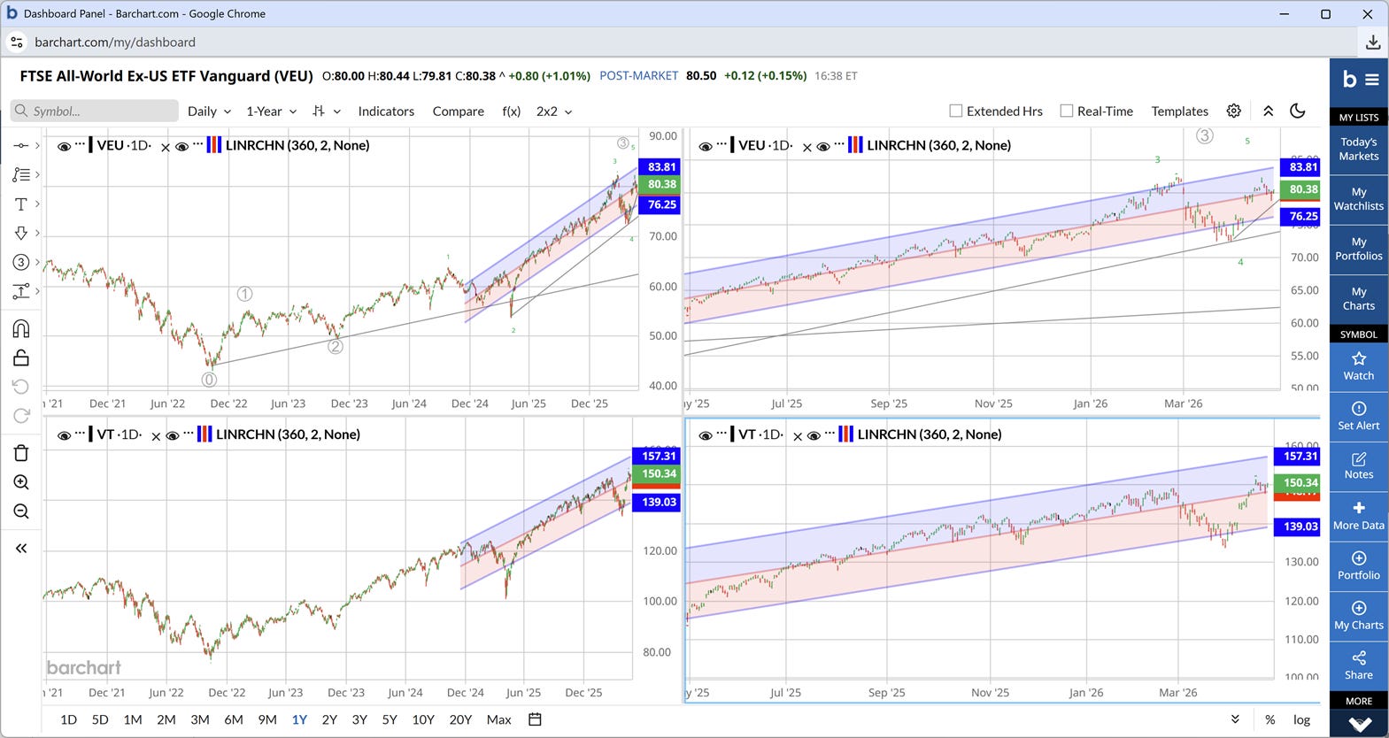 This week’s 1.67% on VEU is internal to sub-5 — a brief consolidation inside an unfolding impulse, not a trend-degree pause. The Slow Stochastic reading printed as extremely overbought the prior week; one sideways week that resets the indicator without breaking the channel is the textbook continuation pattern in a confirmed bull market. Coppock remains rising; the 30W moving average remains below price and is rising; ADX remains in a strong-trend reading.
