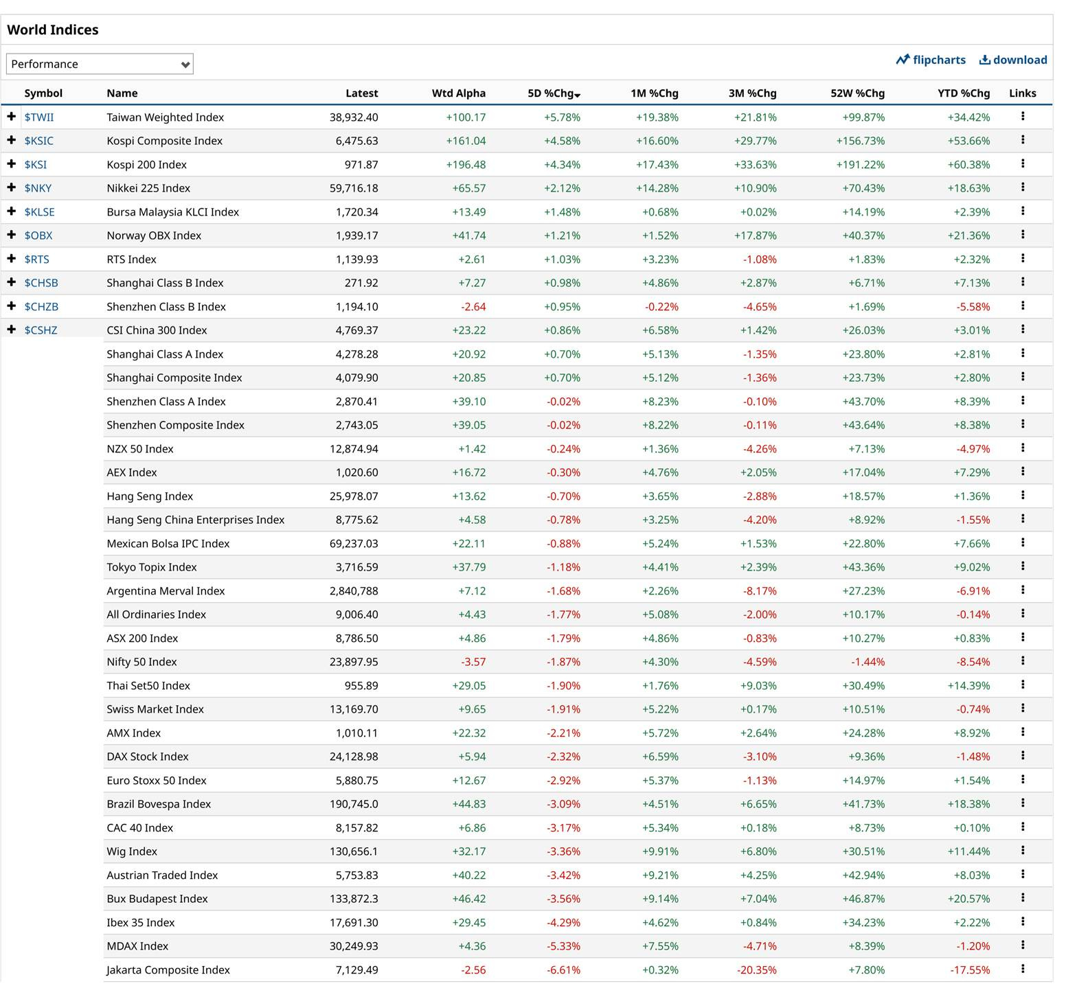 Latin America gave back despite the oil rebound. Brazil fell 3.09% for the week, even as crude rebounded — a sign that the rotation out of risk in EM was broader than the energy bid could offset—Mexico’s IPC −0.88%. The April monthly gains for the region remain intact and substantial, but the weekly print is a clear pause.