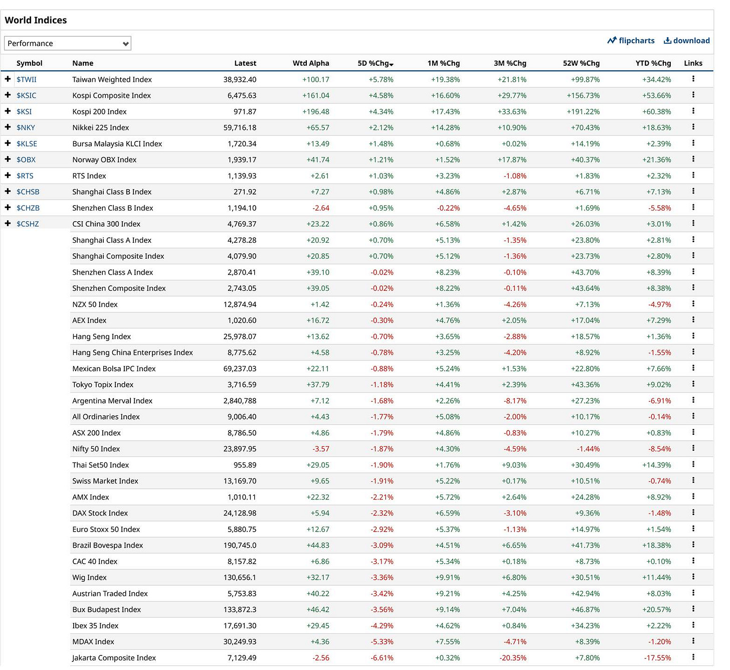 The overall message: global equities were not uniformly strong; leadership was narrow and concentrated in Asian technology-heavy markets. Taiwan, Korea, and Japan’s Nikkei were the bright spots, while Europe, Indonesia, Brazil, India, and Australia were negative. North Asian tech markets light up the map, while Europe and emerging markets flash red.
