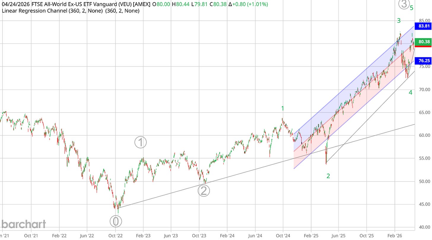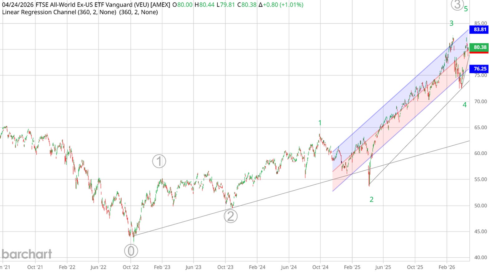 Sub-5 in progress (smaller degree): weekly close below 76 on VEU — break of steep channel lower trendline. Would invalidate sub-5 and frethink, requiring a more complex correction to a greater degree.