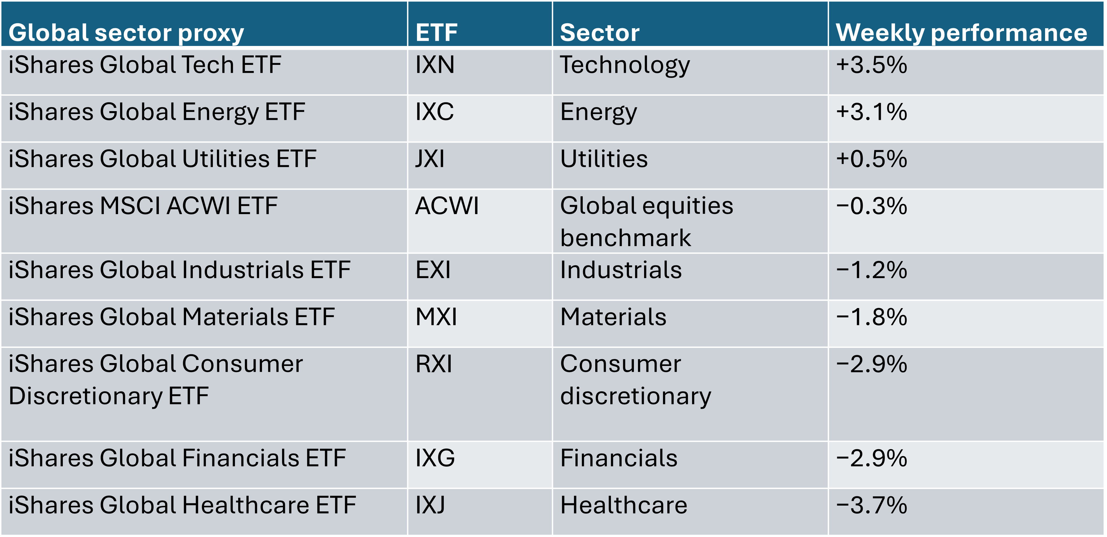 ACWI at −0.3% on the week summarises the picture: the global benchmark held nearly flat because Tech’s heavy index weight and Energy’s gains offset the broad weakness in everything else. The rally was real but narrow.