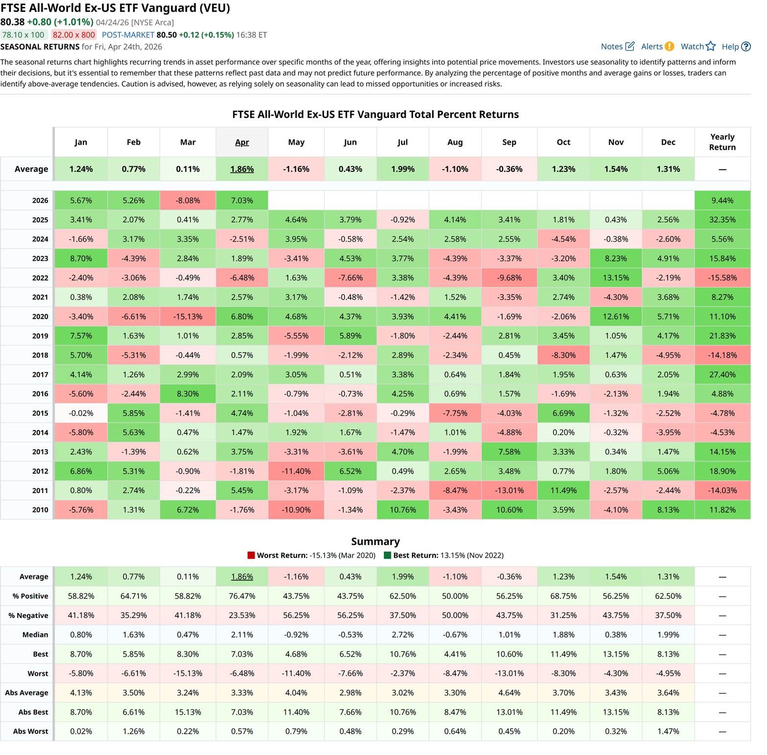 April 2026 is on track to close as one of the strongest months for VEU in its 16-year history. April has averaged +1.95% with a 76.47% hit rate; the historical best case was +8.70%. April 2026 month-to-date through April 24 is approximately +6.5%, comfortably in the top quartile of historical Aprils.