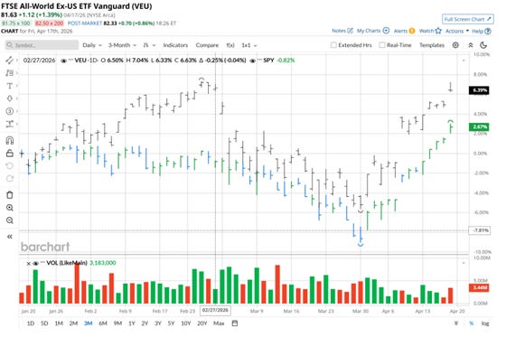 The rally wasn’t confined to the US. VEU closed at 81.63 (+1.39% Friday), with ex-US regional ETFs participating in the broad risk-on.