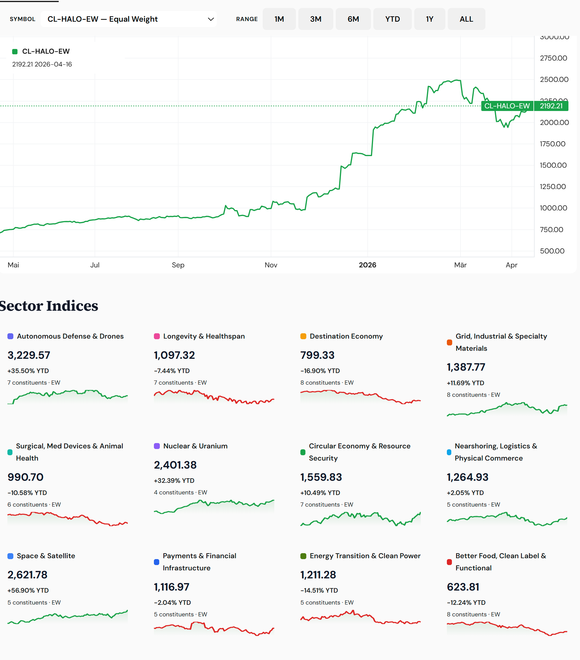 CL-AW25 Agentic Winners at 1,006.47 were up +6.54% weekly and +2.10% monthly. CL-HALO Growth 100 at 2,192.21 posted +3.22% weekly but only +0.55% monthly — and that pattern is exactly what HALO is designed to do.