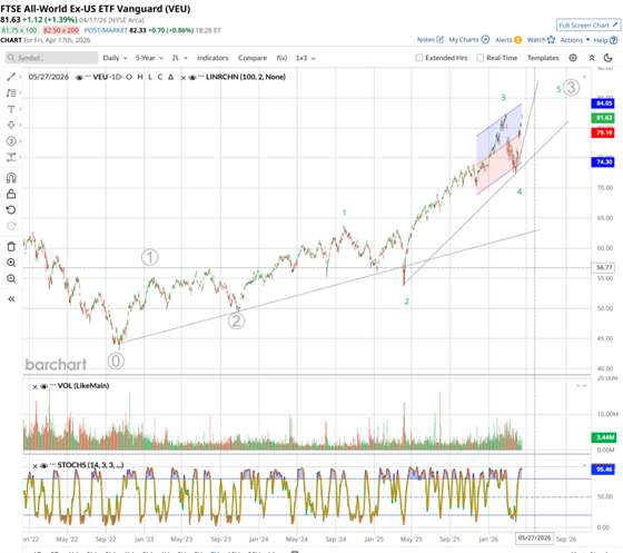 VEU is tracing clear impulse wave patterns — reading as wave 5 of the larger third impulse from the October 2022 low. A new steeper trend channel has been established since February 2025, with breakaway gaps confirming the regime change. Price is now at resistance at prior highs, zone around 83.