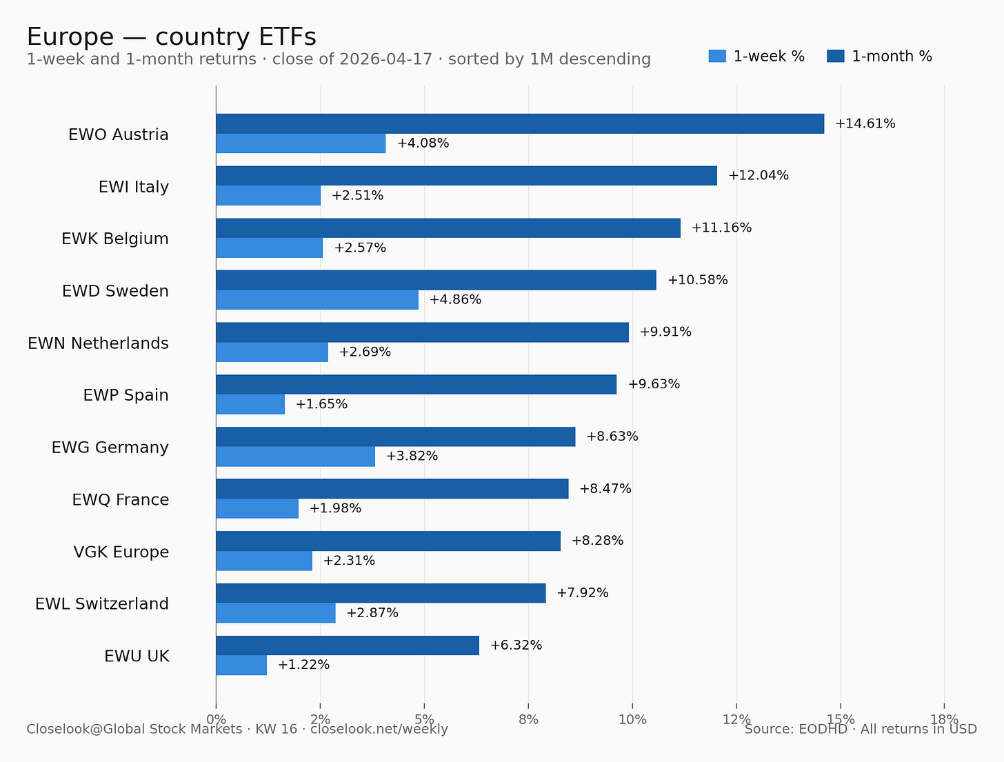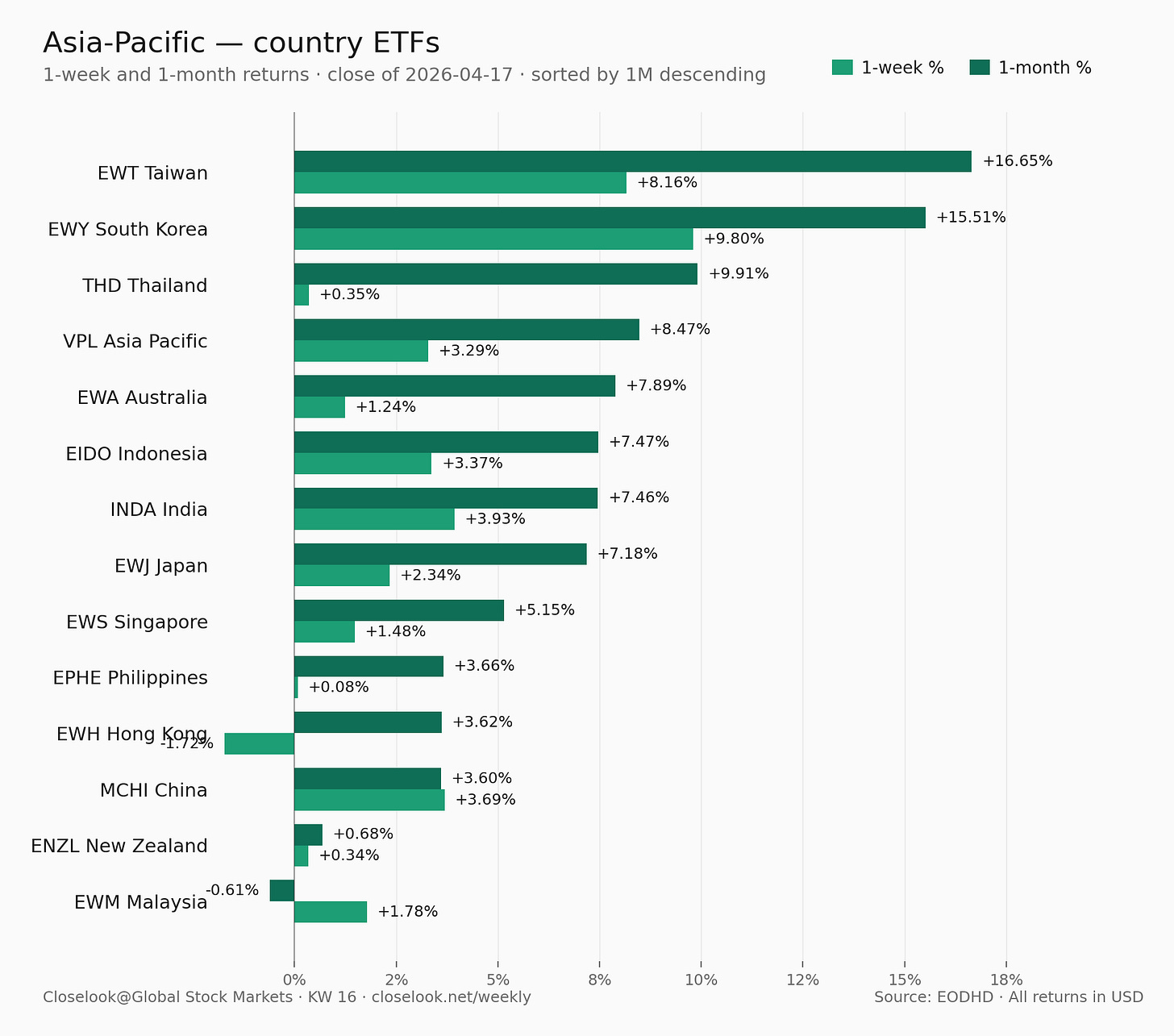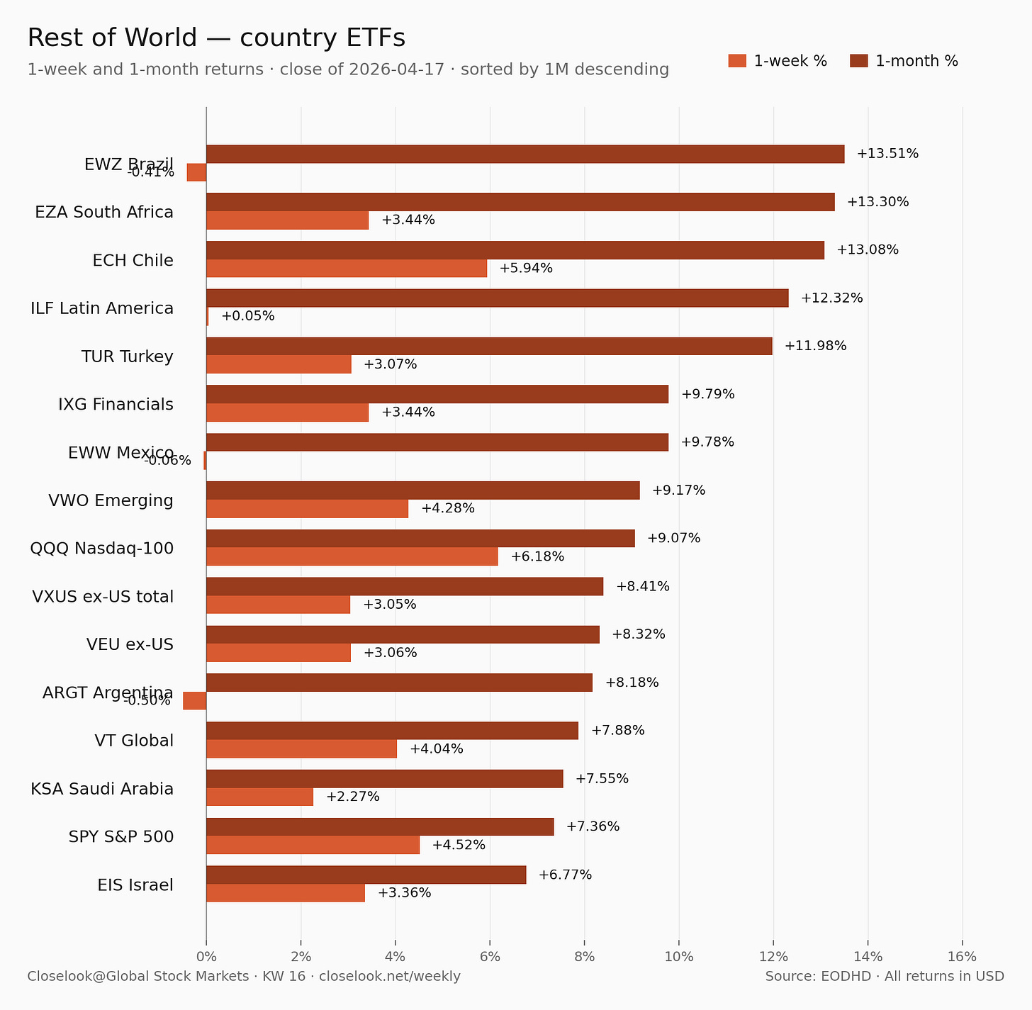 Sorted by 1W % descending · All returns in USD (unhedged) · Close of 2026-04-17