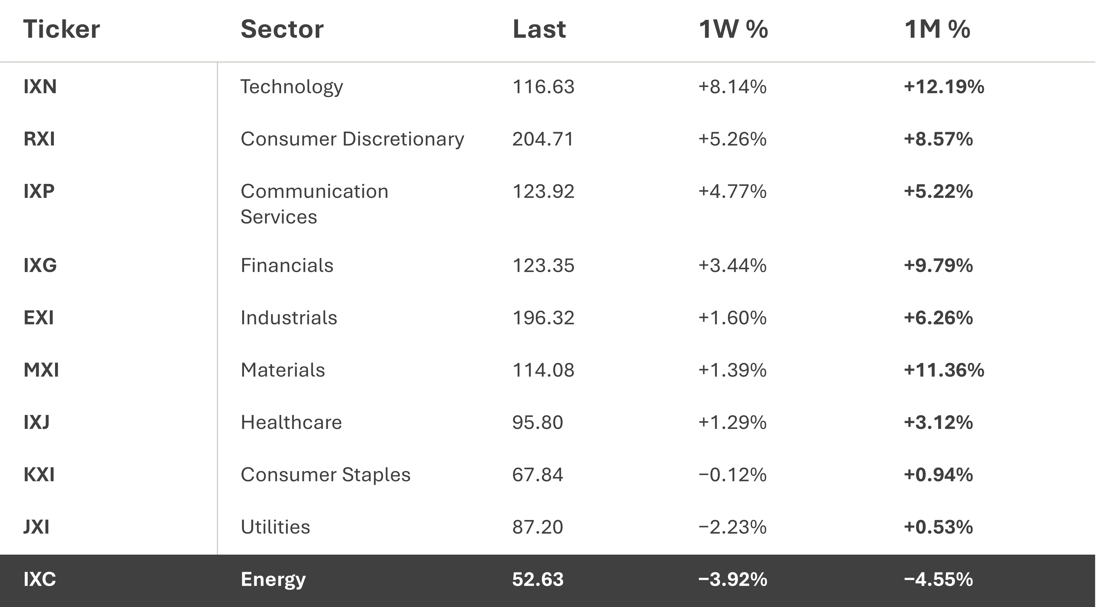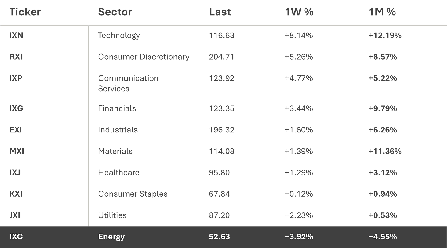 This is not a narrow trade. The only clean losers were Energy (IXC), −3.92% on the week and −4.45% on the month, a direct reflection of the oil plunge, and Utilities (JXI), −2.23% weekly as rate-sensitive defensives rotated out.