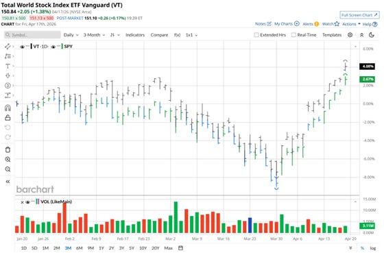 After two weeks of consolidation in March, the global equity rally has resumed its third impulse — and this time the participation is structurally broad. The S&P 500 is at a new record high.