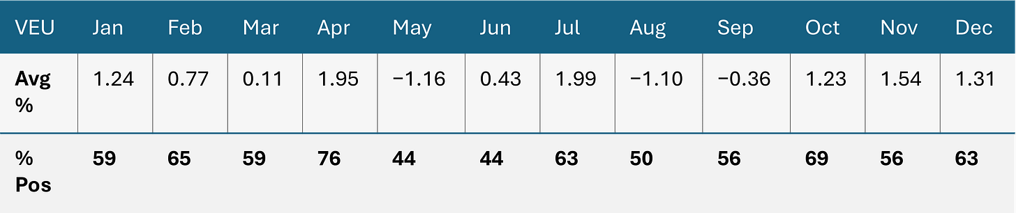 VEU monthly seasonality (16-year history). Current month highlighted.