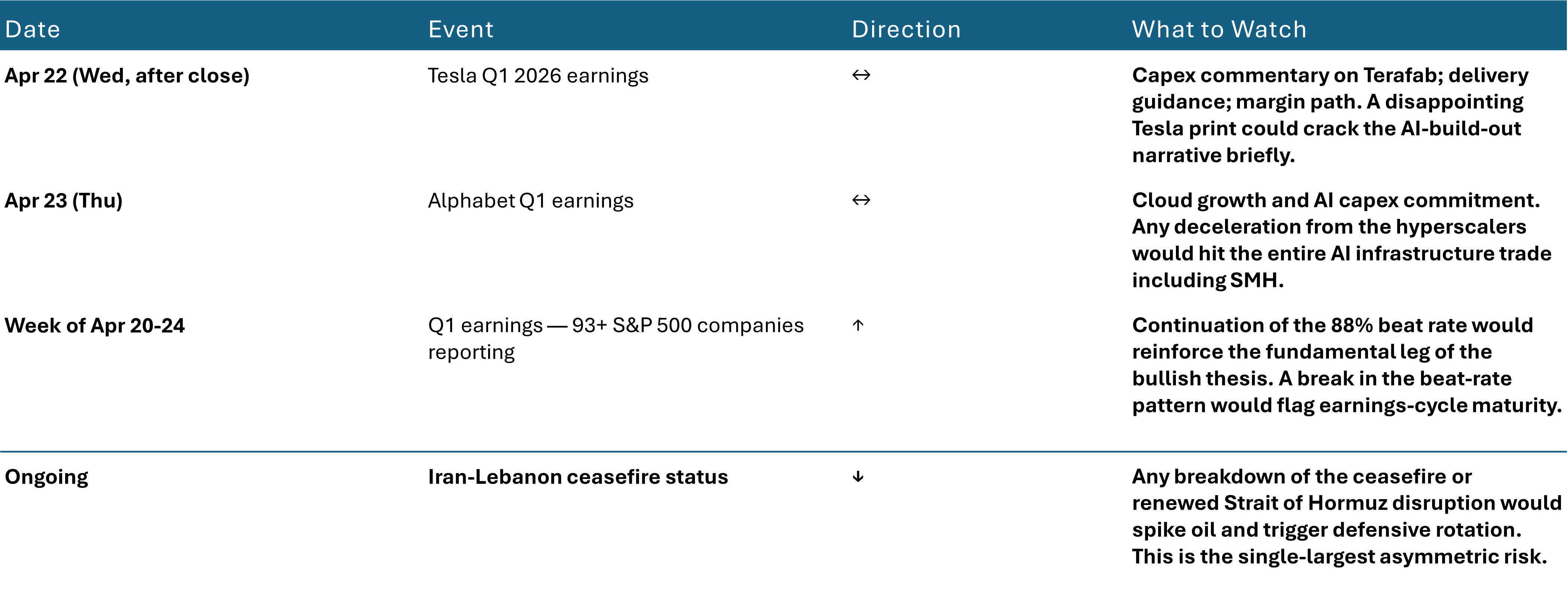 Source: Economic calendar and earnings confirmations. Directions reflect the expected impact on the current Confluent Bullish thesis.