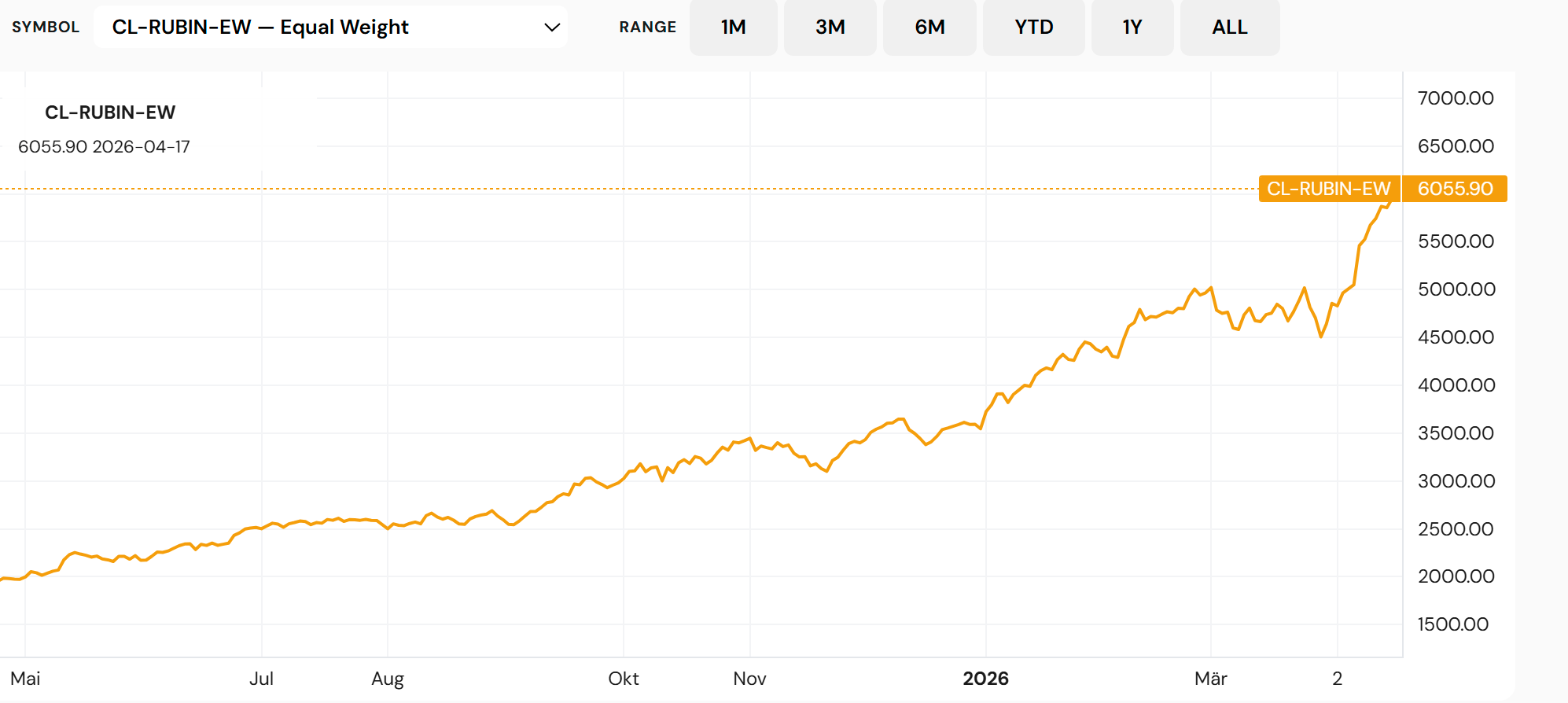 Rubin Build-Out Ex-US is the Closelook construction: filter the Rubin Build-Out 100 universe down to non-US-domiciled names and equal-weight the result. The result is a cleaner read on the ex-US AI supply chain — no Nvidia concentration, no US-listed distortion, deliberate equal-weight exposure to the physical-layer players.