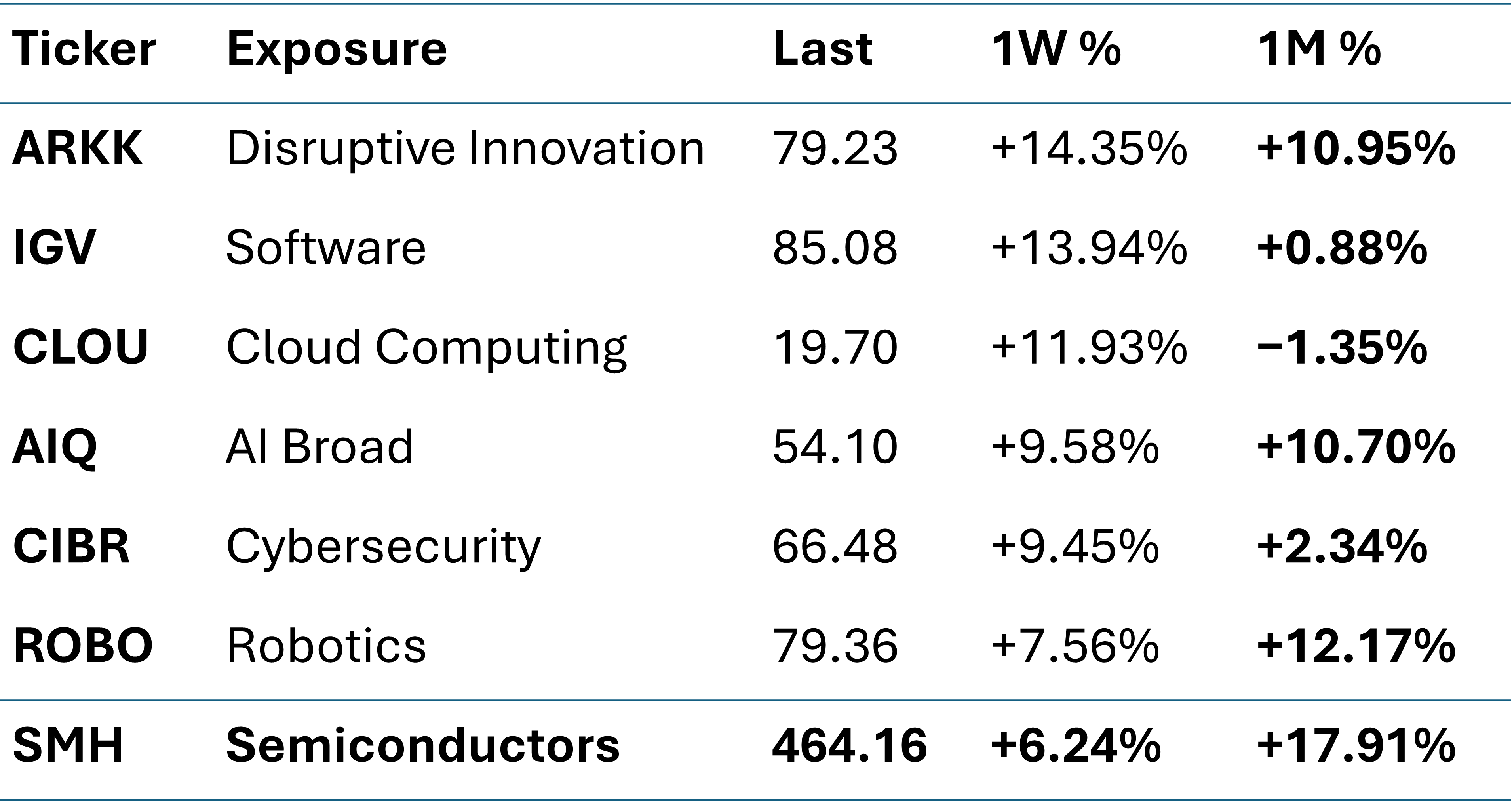 Within the 7 tech thematics, semiconductors (SMH +16.95% monthly) remain the trend leader at a 52-week high. But the more telling signal this week is the software and cloud bottom recovery: IGV +13.94%, CLOU +11.93%, CIBR +9.45% — each with essentially zero 1-month return after a hard drawdown in March.