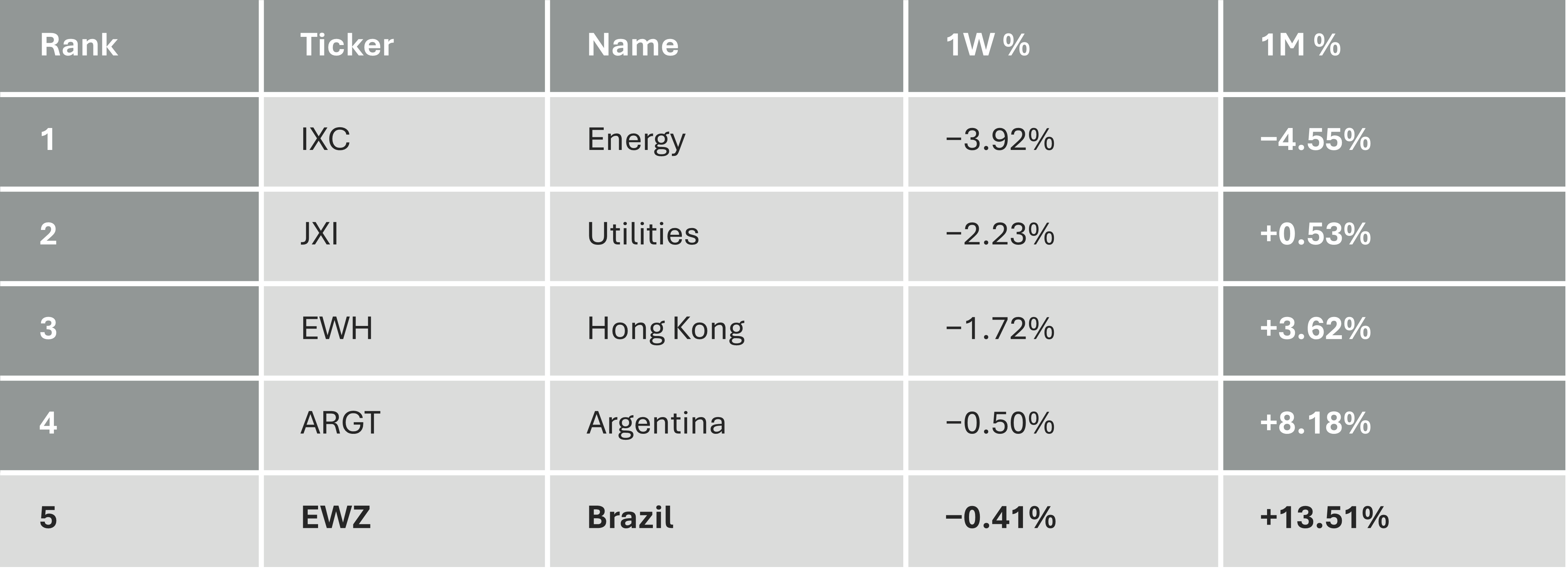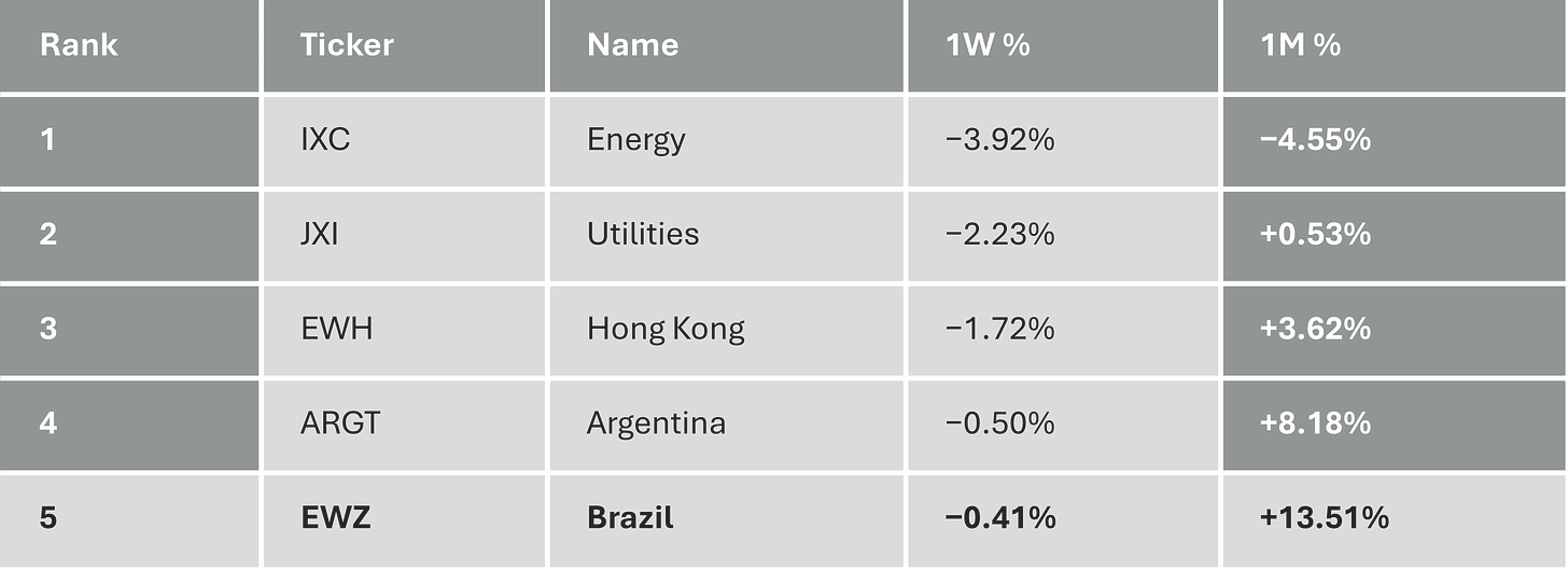 Latin America’s story shifted this week. The region’s monthly return is outstanding — ILF +10.55%, Brazil +12.12%, Chile +11.92%. But the weekly numbers are flat or negative (Brazil: −0.41%, Argentina: −0.50%, Mexico: −0.06%). That is profit-taking after a three-week run, not thesis invalidation.