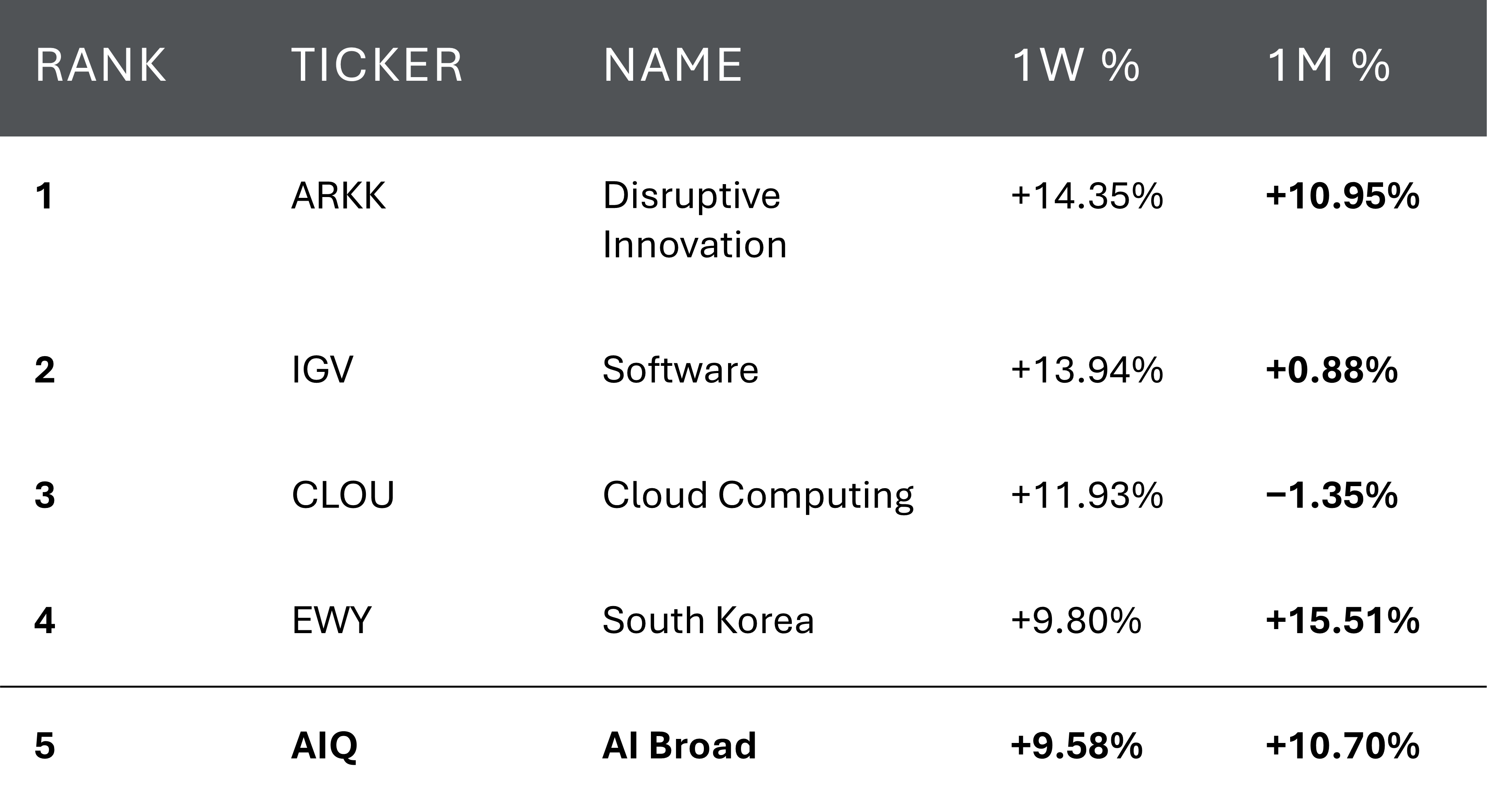 ARKK +14.35% weekly confirms the most-beaten-down disruptor names are being bought. This is the single most important breadth development of the week: the AI trade is no longer limited to infrastructure. Software joins the rally from a completed consolidation, which structurally broadens the AI thesis going into Q1 earnings for the major software names. The question for the next 4-8 weeks is whether IGV and CLOU can follow through beyond the bottom recovery into a proper new trend — the technical setup after a complete March-drawdown-round-trip in 5 trading days needs follow-through confirmation.