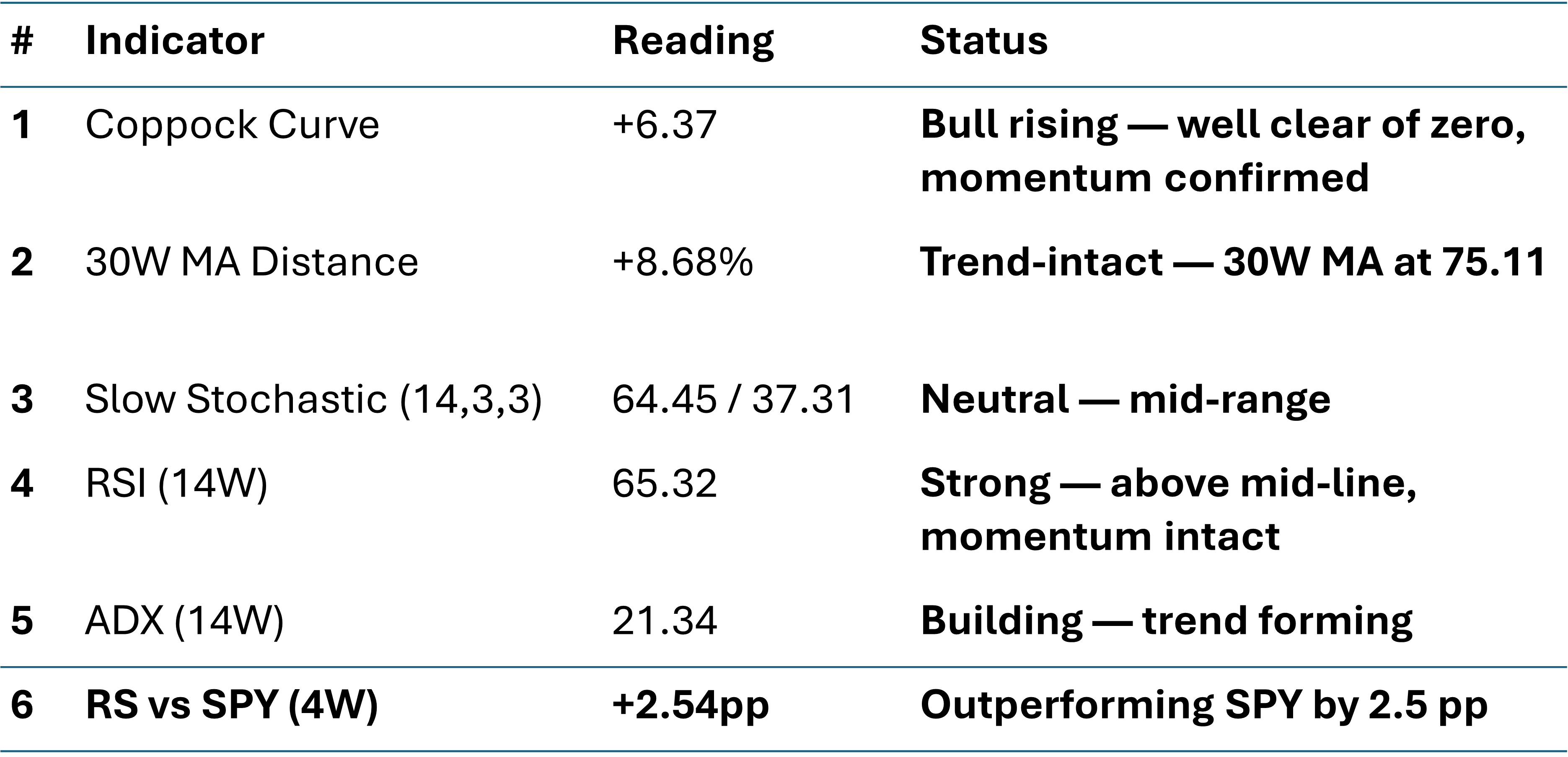 First, Coppock rolling from rising to topping would flag regime maturity — not the end of the bull, but the start of the late innings. Watch for this in the next 4-8 weeks if the Stoch-driven consolidation discussed in Section 6 actually materializes. Second, RS vs SPY dropping below zero — currently the co-leadership regime has held, but a shift to US-only leadership would change the ex-US-specific narrative of this newsletter.