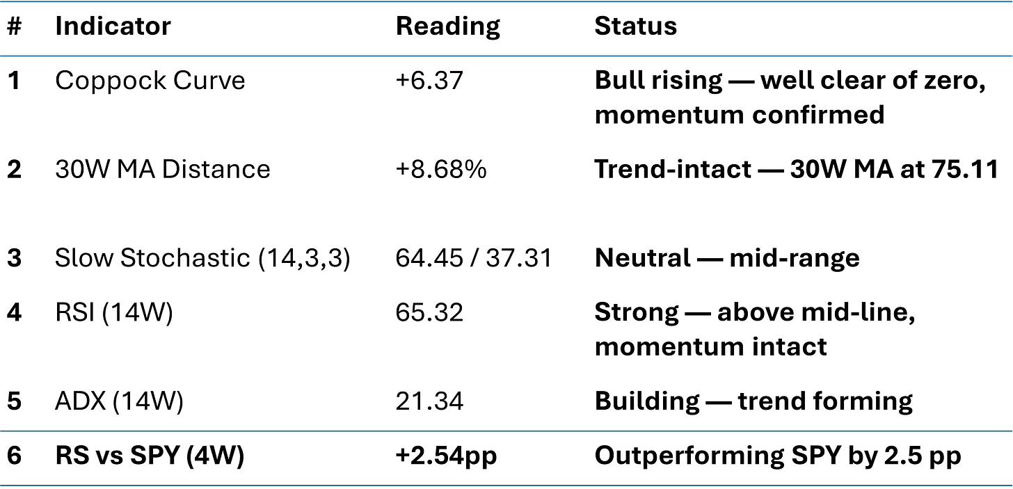 Price is now pressing against the upper channel around 83, which coincides with the prior all-time high zone — the first significant technical resistance since the October 2023 low. The overbought Slow Stochastic at 95.46 is the headline tension. In a confirmed bull regime — and Coppock-confirmed bull, rising 30W MA, ADX trending — extreme Stochastic readings typically sustain for three to six weeks before a meaningful pullback materializes. The more diagnostic signal is Stoch behavior on the next consolidation: if the indicator resets toward 40-60 without price breaking the lower channel (~76), the wave-5 continuation stays intact.