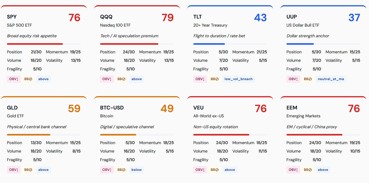 The Money Temperature pipeline, scoring 8 macro instruments across rates, credit, FX, and commodities, sits at 62 this week — in the “Transition” zone. The yellow reading indicates the macro regime is neither cold (deflation/credit stress) nor overheated (stagflation/tight liquidity).