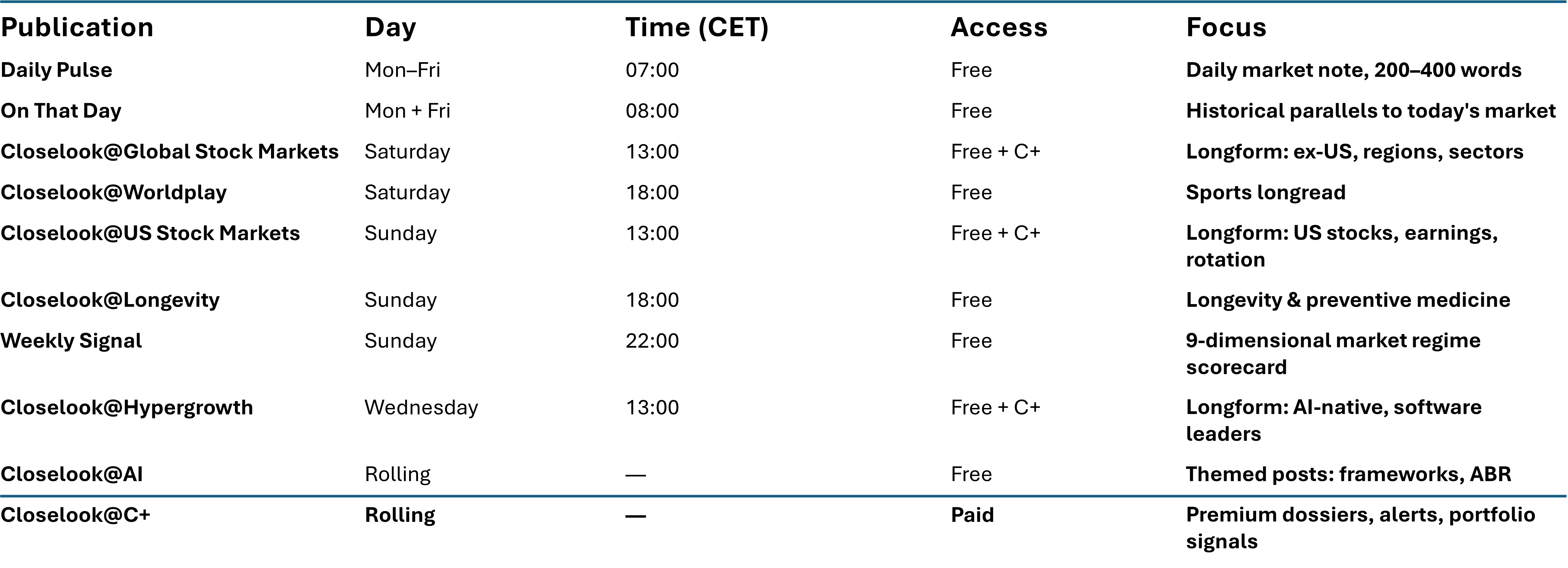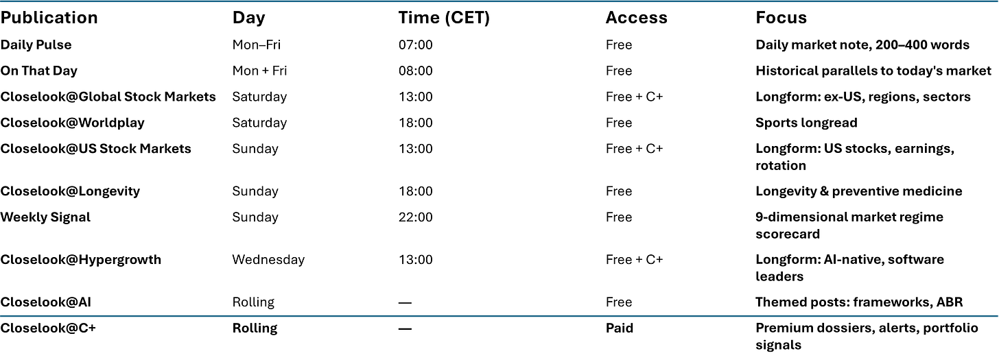 • Weekly Signal — 9-dimensional market regime scorecard (closelook.net/weekly)