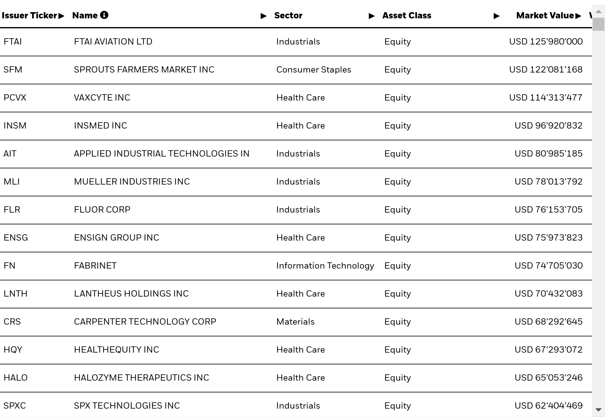 The table below shows the fifty largest Russel 2000 companies by market capitalization.