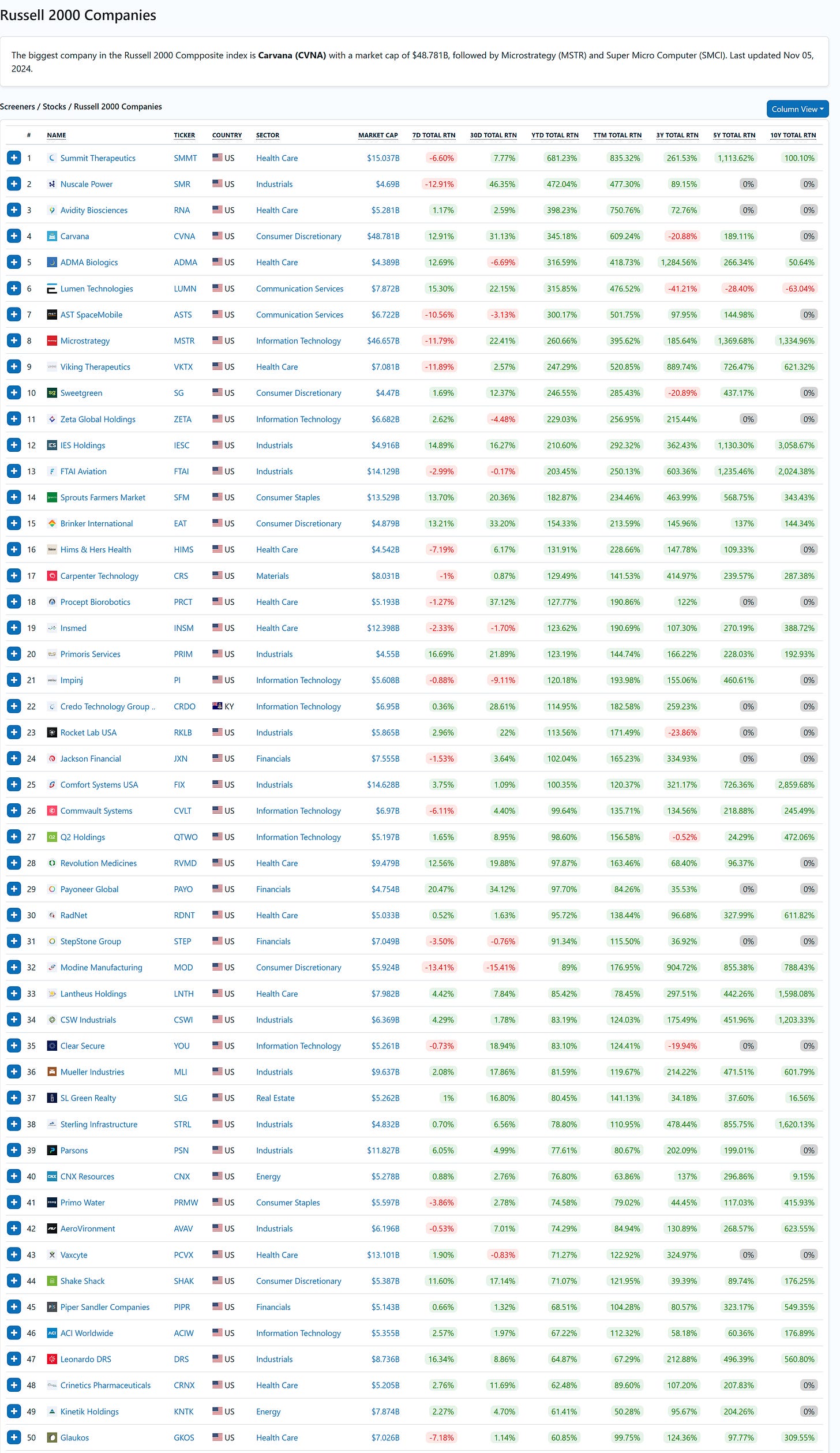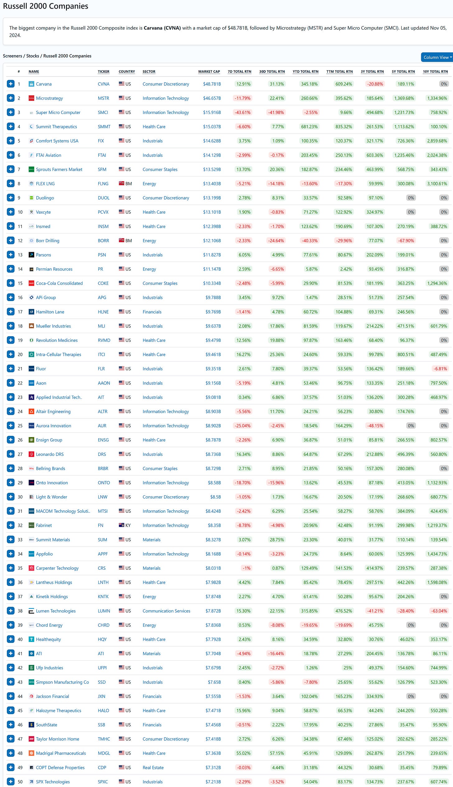 The table below shows the fifty best-performing Russel 2000 companies year-to-date (06 November 2024).